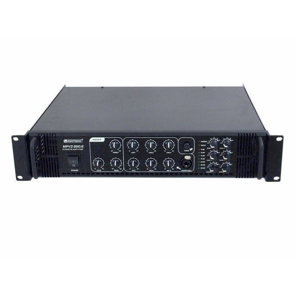 Her er du: Disconetto » brand » Omnitronic OMNITRONIC MPVZ-350.6 PA mixing amplifier På lager På lager, 3-5 hverdage Bedømmelse for OMNITRONIC MPVZ-350.6 PA mixing amplifierProduktet er endnu ikke bedømt 6.149,00DKK ved 1 stk. Vis uden moms Trustpilot 6-zone PA mono mixing amplifier 6-zone PA mono mixing amplifier, 350 watts, adjustable zonesComfortable control of PA speakers via 6-zone technology6 PA zone outputs with separate 5-step level controlsMaster PA output (70 V and 100 V)Output for low-impedance speakers (4-16 ohms)2 rear microphone inputs (6.3 mm jack, unbal.)1 front microphone input (combination XLR/6.3 mm jack, unbal.) with adjustable priority circuitAll microphone inputs with separate level controls3 line inputs (stereo RCA) with separate level controls1 line output (stereo RCA)Chime, switchableTreble and bass control for the output signal7-fold LED level displayMaster control for the output signalFan-cooledProtection circuits with LED indication: over current, short circuit, turn-on delayRack installationMaster Equalizer: 1 x 2 band tone control Mono Power supply:230 V AC, 50 HzOutput power:350 W RMSOutput type:70 V, 100 V or 4-16 ohmsOutput current:5 A (70 V), 3.5 A (100 V)Mic inputs:5 mV, 600 ohmsLine inputs:300 mV, 10 kohmsSpeaker connectors:Screw connectors, terminal blockDistortion:0.5 % (1 kHz)S/N ratio:85 dB (line), 75 dB (mic)Dimensions:483 x 385 x 92 mmWeight:16 kgPower consumption:700.00 WOutput power:350 W RMSFrequency range:80 - 16000 HzHeight:8,9 cmDepths:38,5 cmWidth:48,3 cm Varenr.: E-80709791 Vi anbefaler Omnitronic M-60 Dynamisk mikrofon til sang DKK 309,00 19" Metal rack. Åbent. 6 Unit DKK 1.269,00 Rackskuffe i stål. 2 unit. Dybde 36 cm. Med lås DKK 769,00 Kunder købte også OMNITRONIC MP-350P PA mixing amplifier DKK 5.219,00