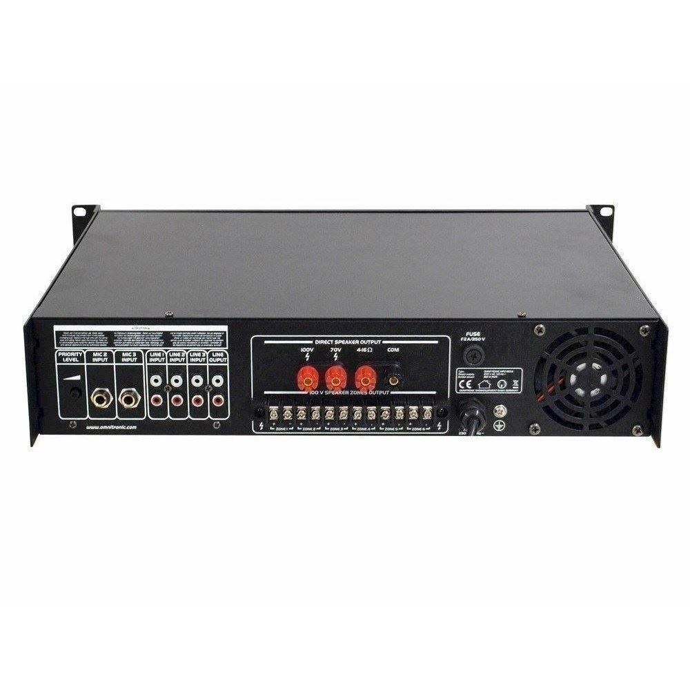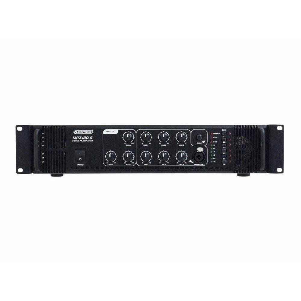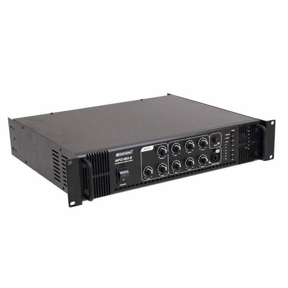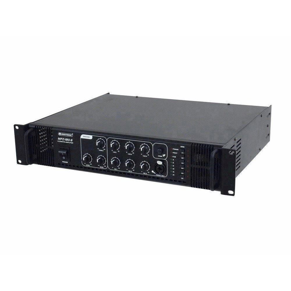 Her er du: Disconetto » brand » Omnitronic OMNITRONIC MPZ-180.6 PA mixing amplifier På lager På lager, 3-5 hverdage Bedømmelse for OMNITRONIC MPZ-180.6 PA mixing amplifierProduktet er endnu ikke bedømt 3.989,00DKK ved 1 stk. Vis uden moms Trustpilot 6-zone PA mono mixing amplifier 6-zone PA mono mixing amplifier, 180 watts, zones switchableComfortable control of PA speakers via 6-zone technology6 PA zone outputs, independently switchable on the front panelMaster PA output (70 V and 100 V)Output for low-impedance speakers (4-16 ohms)2 rear microphone inputs (6.3 mm jack, unbal.)1 front microphone input (combination XLR/6.3 mm jack, unbal.) with adjustable priority circuitAll microphone inputs with separate level controls3 line inputs (stereo RCA) with separate level controls1 line output (stereo RCA)Chime, switchableTreble and bass control for the output signal7-fold LED level displayMaster control for the output signalFan-cooledProtection circuits with LED indication: over current, short circuit, turn-on delayRack installation, brackets detachableMaster Equalizer: 1 x 2 band tone control Mono Power supply:230 V AC, 50 HzOutput power:180 W RMSOutput type:70 V, 100 V or 4-16 ohmsOutput current:2.5 A (70 V), 1.8 A (100 V)Mic inputs:5 mV, 600 ohmsLine inputs:300 mV, 10 kohmsSpeaker connectors:Screw connectors, terminal blockDistortion:0.5 % (1 kHz)S/N ratio:85 dB (line), 75 dB (mic)Dimensions:483 x 385 x 92 mmWeight:12 kgPower consumption:360.00 WOutput power:180 W RMSFrequency range:80 - 16000 HzHeight:8,9 cmDepths:38,5 cmWidth:48,3 cm Varenr.: E-80709721 Vi anbefaler OMNITRONIC PA volume controller, 30 W mono wh DKK 339,00 19" Metal rack. Åbent. 6 Unit DKK 1.269,00 Rackskuffe i stål. 2 unit. Dybde 36 cm. Med lås DKK 769,00