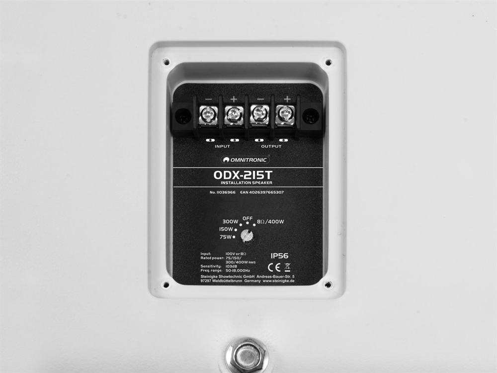Her er du: Disconetto » LYD » Højttalere » Installations højttaler » Fulltone højttalere OMNITRONIC ODX-215T Installation Speaker 100V white På lager På lager, 3-5 hverdage Bedømmelse for OMNITRONIC ODX-215T Installation Speaker 100V whiteProduktet er endnu ikke bedømt 7.769,00DKK ved 1 stk. Vis uden moms Trustpilot Weatherproof 15" wall speakers with mount, 400 W RMSDenne vare kan KUN sendes kun med fragtmand Weatherproof 15" wall speakers with mount, 400 W RMS100 V PA speaker system with an excellent sound for general applications2-way coaxial system with 38 cm woofer (15") and 3.6 cm tweeter (1.4")Weatherproof plastic cabinet (IP56)100 V transformer with 3 power taps (75 W, 150 W, 300 W)Power selector switch with 8 ohms operating position (400 W)Swivel mounting bracketScrew terminals for parallel connectionFor outdoor amplifying systems IP classification:IP56Frequency range:50 - 18000 HzSensitivity:103 dB (1W/1m)Max. SPL:129 dBDispersion angle:80° x 80°Crossover frequency:1500 HzImpedance:8 Ohm; 100 V ELAAttachment:Mounting bracketPower tapping:75W; 150W; 300W; 400W RMS via Selector switch switchableConnections:Input: Speakers via screw terminalSpeakers:woofer (15") approx 38 cmTweeter highs (1.35") appox 3,5cmWidth:46,8 cmHeight:50 cmDepth:59,5 cmWeight:30,55 kg Varenr.: E-11036966 Vi anbefaler OMNITRONIC ODX-115ST Installation Subwoofer 100V white DKK 6.759,00