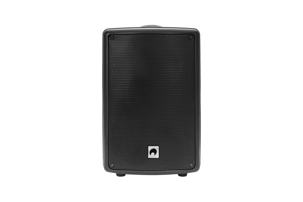 - Lightweight black plastic enclosure with metal grille and carrying handle