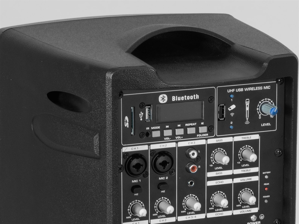 Compact, lightweight and useful: The WAMS-08BT MK2 is an extremely lightweight yet powerful PA system with rechargeable battery for mobile use. Whether for street musicians, at lectures, family get-togethers or in the aerobics group: Thanks to the versatile connection options you are flexible on the road.The great-sounding all-in-one system with power-efficient class D amplifier and 40 watts output power neither requires power nor audio cables. Enjoy music wirelessly from your smartphone or any other Bluetooth device via the integrated Bluetooth audio receiver. Get a wireless microphone system instantly by plugging in the optional USB dongle which comes with two wireless microphones. Thanks to the 863-865 MHz harmonized frequency band, this system does not require a license.The 2-way bass reflex system with 20 cm (8") woofer provides powerful sound despite the small size. Equipped with a 3-channel power mixer, the WAMS-08BT MK2 also features an MP3 player with SD card slot, USB port and IR remote control. A stereo input channel for line sources (e.g. CD player or notebook) and two mono input channels for instruments or cabled microphones provide additional flexibility. The 2-band EQ lets you control bass and treble. The powerful 11 V battery allows for continuous playback at full volume for up to 4 hours. By retrofitting an additional battery, the operation time can even be doubled. The WAMS-08BT MK2 is easy to carry thanks to its handle and weighs only 7 kg. It is prepared for tripod mounting with a flange.