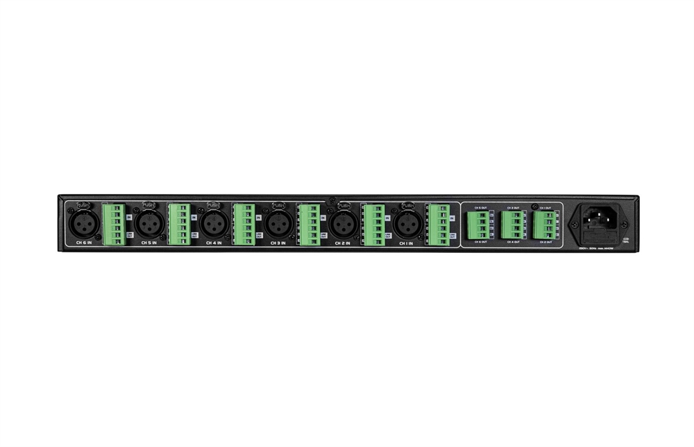 | Connections: | Input: line via 4 x 3-pin XLR Output: line via 4 x 3-pin XLR Output: speaker via 4 x screw plug-in terminal Input: 4 x screw plug-in terminal |