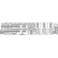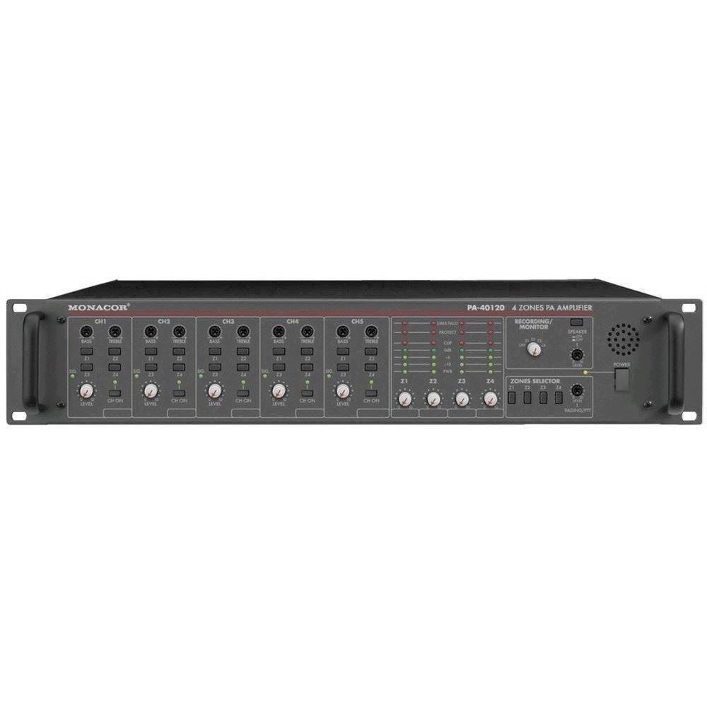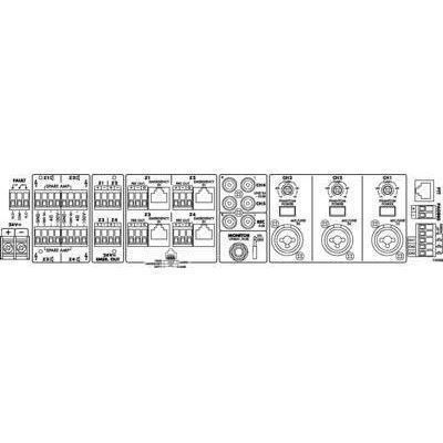 | Connections | 3 x combo 6.3 mm/XLR (mic/line), 2 x RCA L/R (line), 1 x RJ45 (push-to-talk mic), 4 x screw terminals (speakers), 1 x 6.3 mm jack (monitor), 4 x RJ45 (emergency), 4 x screw terminals (preamplifier), screw terminals (chime button), 1 x RCA L/R (record) |