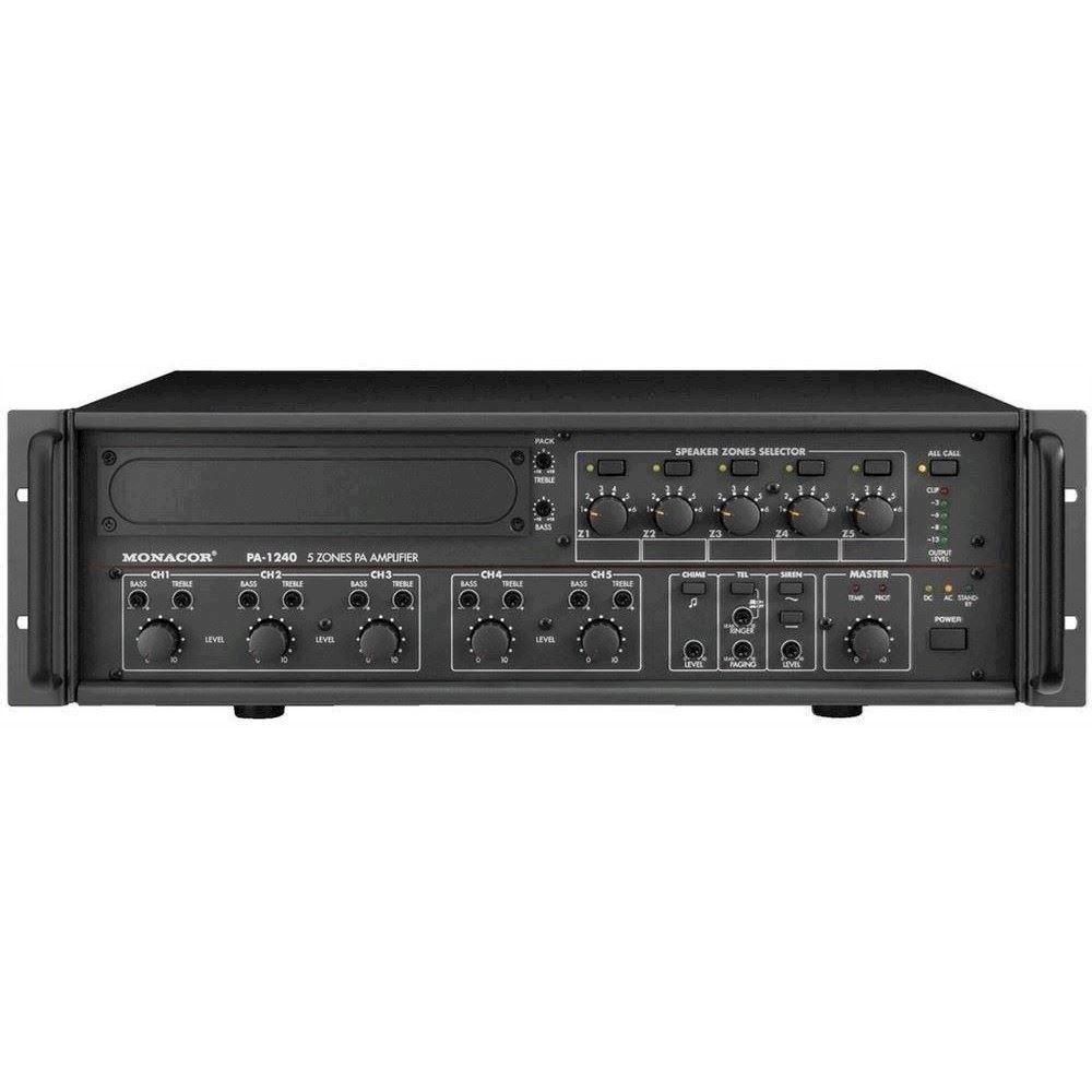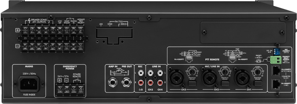 | Connections | 3 x combo 6.3 mm/XLR (mic/line inputs), 2 x RCA L/R (line inputs), 2 x RJ45 (push-to-talk microphone), screw terminals (telephone system), 1 x 6.3 mm jack (preamplifier), 1 x 6.3 mm jack (ext. amplifier), 1 x RCA L/R (record), screw terminals (speakers) |