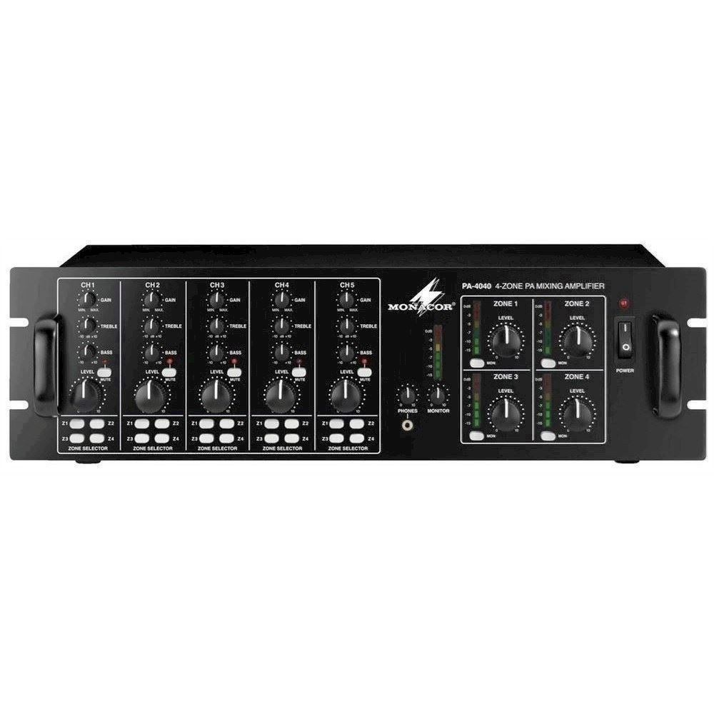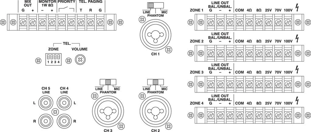 | Connections | 3 x combo 6.3 mm/XLR (mic/line), 2 x RCA L/R (line), screw terminal (speaker zone), screw terminal (speaker monitor), screw terminal (mix out), screw terminal (paging), screw terminal (priority) 3.5 mm stereo jack (headphones) |