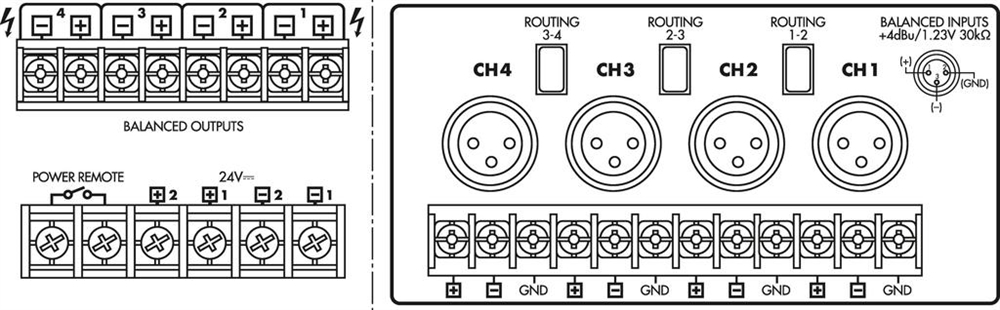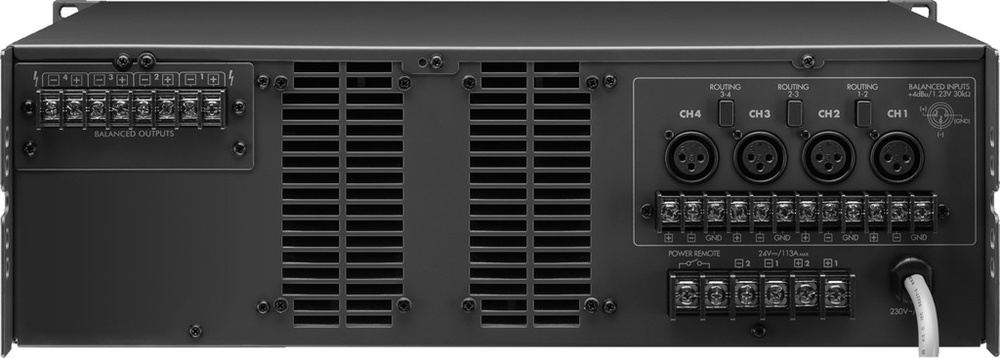 | Connections | 4 x XLR (inputs), screw terminals (speakers) |