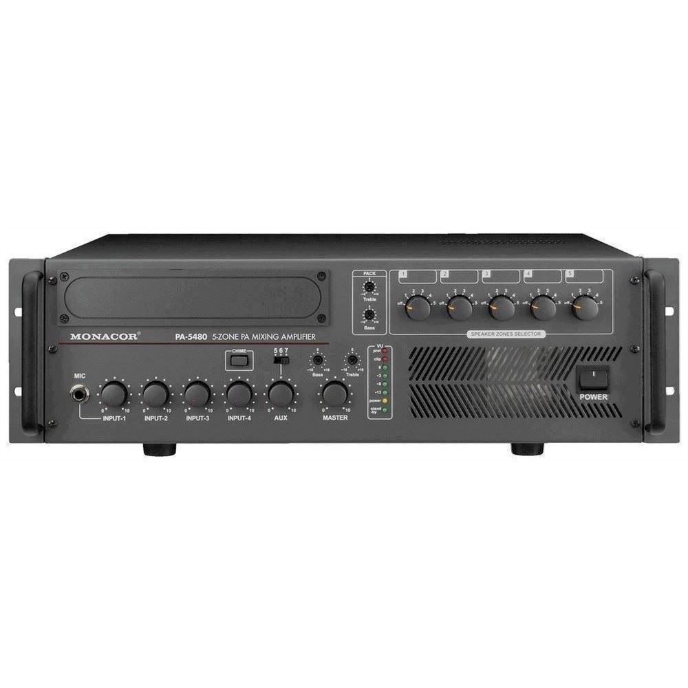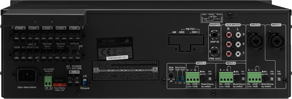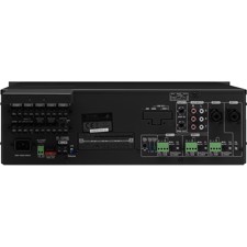 | Connections | 1 x 6.3 mm jack (mic), 2 x combo 6.3 mm/XLR (mic/line), 3 x RCA L/R (line), Screw terminals (line), 1 x 6.3 mm jack (preamplifier input), Screw terminal (push-to-talk mic), Screw terminal (zone paging mic), Screw terminals (speakers), 1 x 6.3 mm jack (preamplifier output), Screw terminals (chime button) |