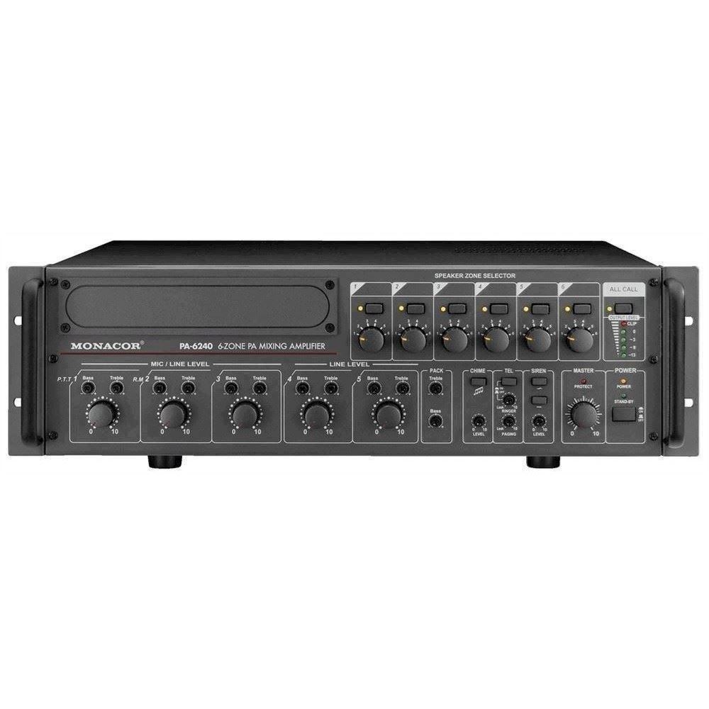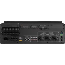 | Connections | 3 x combo 6.3 mm/XLR (mic/line), 2 x RCA L/R (line), 1 x 6.3 mm jack (preamplifier), 1 x RJ45 (push-to-talk mic), screw terminals (telephone system), screw terminals (speakers), 1 x 6.3 mm jack (ext. amplifier), 1 x RCA L/R (record) |