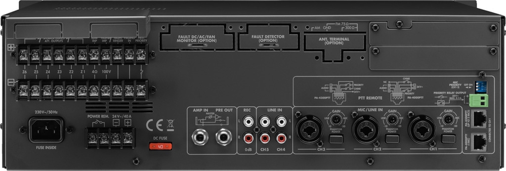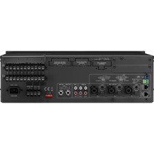 | Connections | 3 x combo 6.3 mm/XLR (mic/line), 2 x RCA L/R (line), 1 x 6.3 mm jack (preamplifier), 1 x RJ45 (push-to-talk mic), screw terminals (telephone system), screw terminals (speakers), 1 x 6.3 mm jack (ext. amplifier), 1 x RCA L/R (record) |