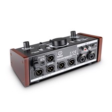 The Monicon L's stereo input is on balanced combo sockets, the AUX input features a 3.5 mm TRS jack and RCA connectors. The compact console sports dual outputs for two pairs of monitor speakers and a summed mono output on XLR connectors. The stereo and AUX inputs are alternatively selectable, the outputs can be activated individually and in tandem. Besides the large stereo volume knob the Monicon L provides mono, mute and PFL switches, a 6.35 mm TRS headphone jack as well as separate AUX and headphone level controls for additional convenience.