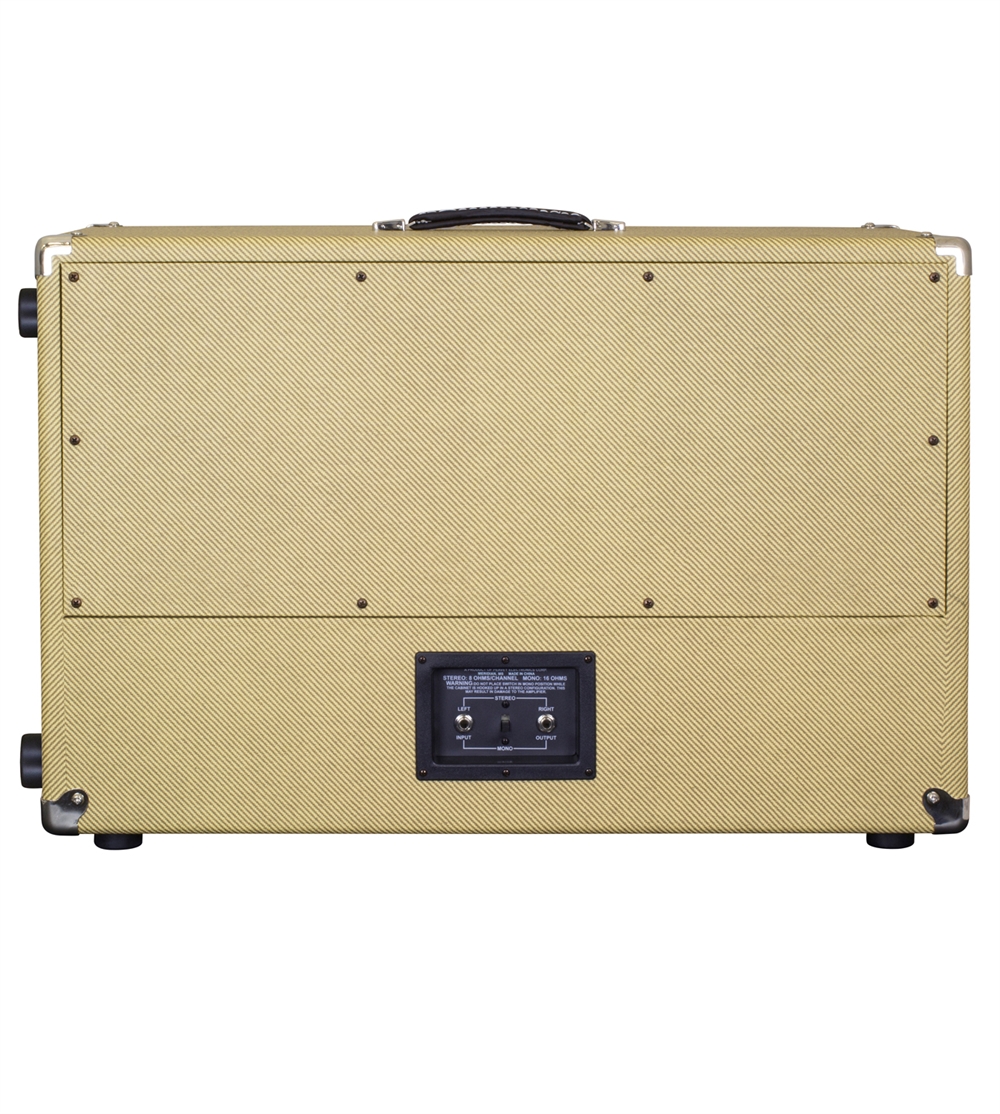 No matter how good your amp is, the speaker cabinet must also be top quality to have a great tone. The Peavey 212-C has 18mm plywood construction, 1 Celestion Vintage 30 speaker and 1 Celestion G12-T 75 speaker. The G12-T 75 has enhanced high and low end while the Vintage 30 is well renowned for its midrange, so the 2 speakers complement each other! The back of the cabinet is convertible for changing the cabinet to an open back configuration. The white piping gives the black grill and black tolex a nice finished look. A stereo/mono input cup, rubber feet and metal corners complete the package.