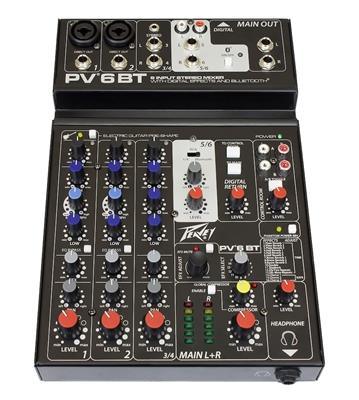 The PV 6 BT mixer includes 2 channels of reference-quality mic preamps, 2 direct outputs for recording, a stereo input channel, and a dedicated media channel, and Bluetooth® wireless input and high quality digital effects. Other features include 48 volt phantom power, dual selectable control room outputs, built-in stereo compressor, an on-board selectable high impedance preamp equalized for guitar, 3-band EQ per channel with bypass, signal/clip indicators, and a stereo master LED meter bridge.