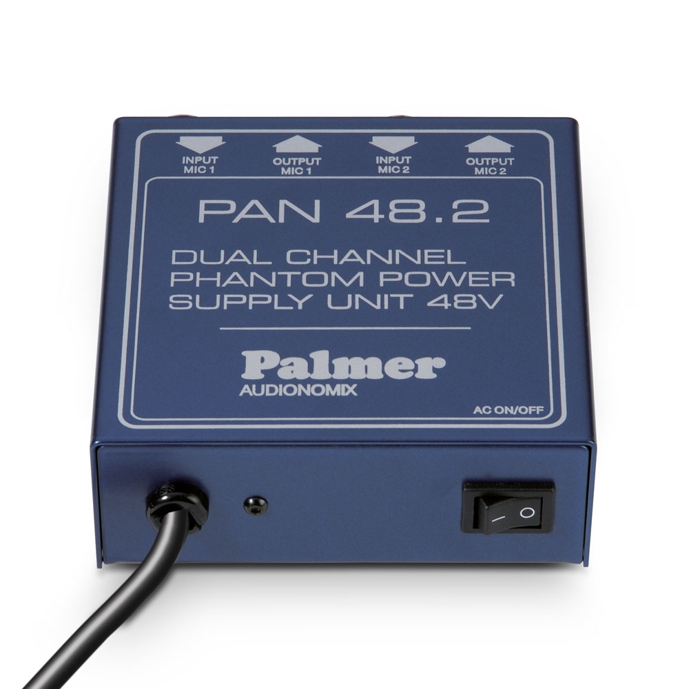 Palmer Pan 48 is a unit for the external power supply of phantom powered appliances. Due to the high current level of a maximum of 20mA, the application is not just limited to condenser microphones. PAN 48 is excellent for supplying phantom powered active DI-boxes. The box has two channels. Specifications: 2 channels, each channel: Microphone input: XLR/f Pin 2 & 3 +48VDC, Pin 1 Ground Output: XLR/m no DC voltage Ground lift switch Phantom power stabilized ±5%. Low ripple, low noise Max. current 20mA totally. LED control. Metal casing