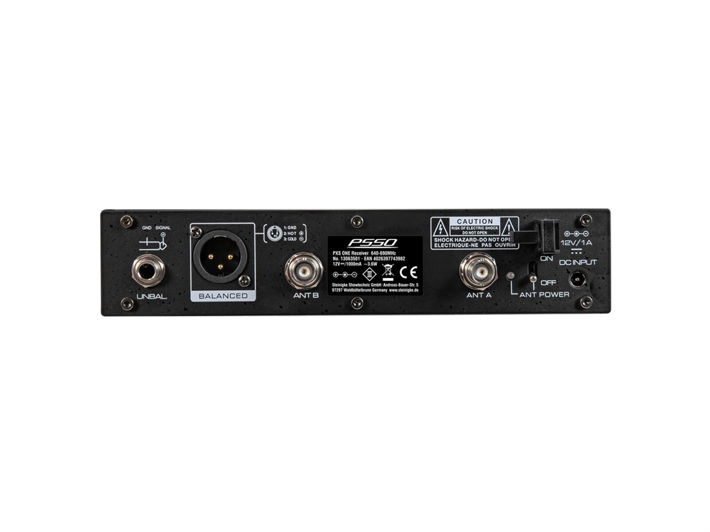 | Connections: | Input: antenna via 2 x BNC (F) 11,54 V Output: microphone via 1 x 6.3 mm plug (unbal.) Output: microphone via 1 x 3-pin XLR (M) mounting version |