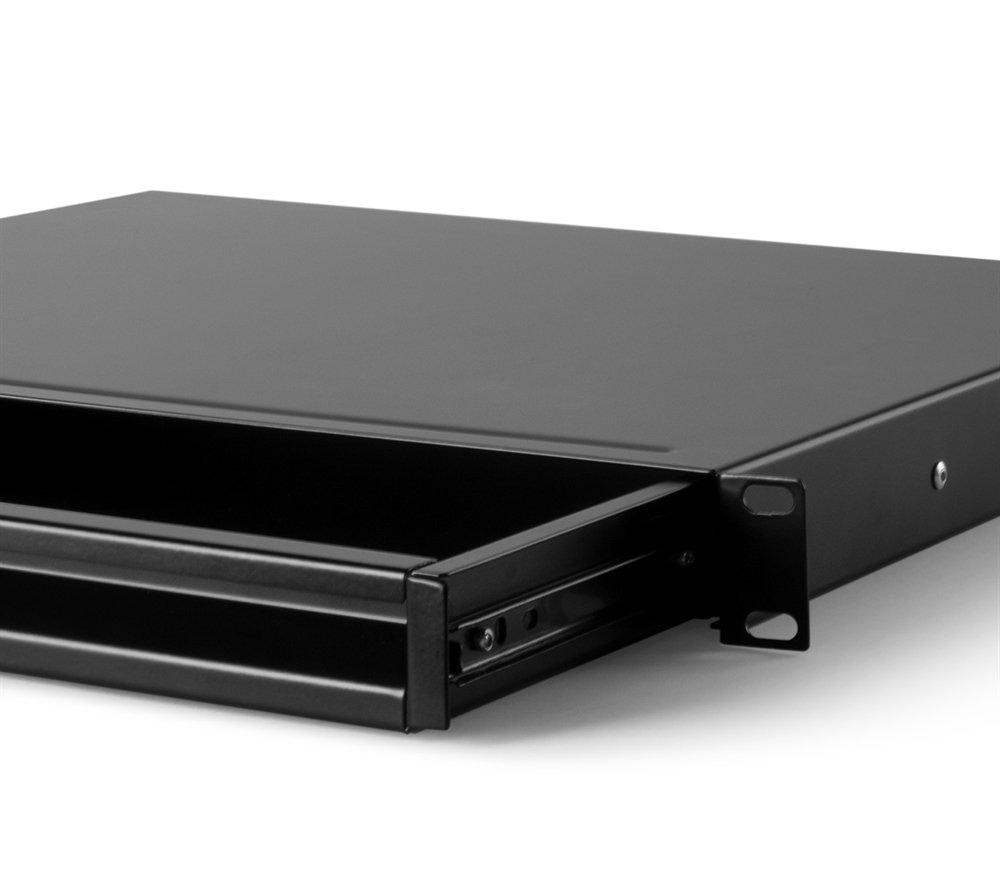 The ERGO is a very affordable rackmount drawer with heavy-duty 1.5 mm steel construction and easy, ergonomic operation. It integrates a recessed pull handle that runs the width of the drawer and a convenient push-to-close, pull-to-open latching mechanism with 1,5 kg pull force. This economy rack drawer has a black semi-gloss powder coating finish and 10 kg load capacity. It features smooth-running full extension ball bearing slides with front disconnect for easy drawer removal.
