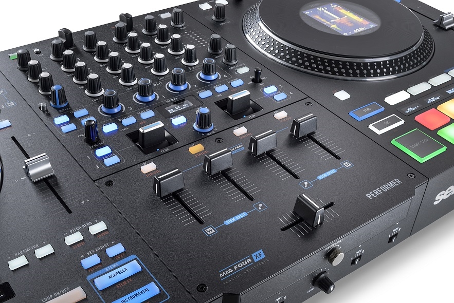Ud over den justerbare MAG FOUR crossfader, har PERFORMER mixer sektionen 4 redesignede PRECISION FEEL FADERS. Disse justerbare fadere med justerbar modstand, bruger det samme dobbelte skinne-mekaniske system som MAG FOUR, men i en vandret fader, der er monteret lodret på printkortet. Dette udmønter sig i en gnidningsfri, pålidelig og ensartet respons, når du spiller. Faderne kan tilpasses yderligere via den indbyggede menu, hvilket giver dig mulighed for f.eks. at vende 180 grader og justere cut-in kurven fra 0-100%.