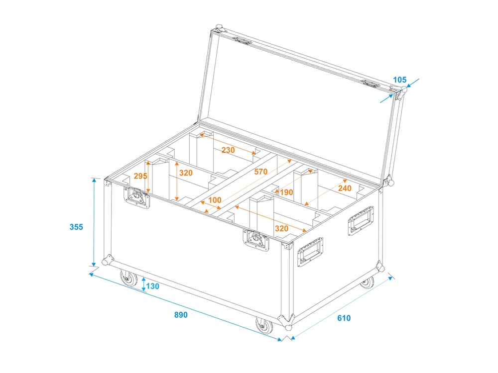 Her er du: Disconetto » brand » Roadinger ROADINGER Flightcase 4x LED TMH-X4 På lager På lager, 3-5 hverdage Bedømmelse for ROADINGER Flightcase 4x LED TMH-X4Produktet er endnu ikke bedømt 8.199,00DKK ved 1 stk. Vis uden moms Trustpilot Denne vare kan KUN sendes kun med fragtmand PRO flightcase for 4x LED TMH-X4Fitted for four devicesAdditional accessory compartmentCompartments upholstered with foamHigh-quality workmanship with birch multiplex, dark brown laminatedAluminum profile frames with rounded edgesThree-leg steel ball corners4 castors Ø100 mm, 2 of which with locking brakes2 tip-over locks2 chrome butterfly locks4 chrome case handlesTrademark hardwareTransport aid: With wheels Maximum load:100 kgColor:Black, laminatedMaterial:Birch multiplex, 7 mmAdditional dimensions:Device compartment 32 cm x 32 cm x 24 cmAccessory compartment 33.5 cm x 10 cm x 57 cmWidth:59 cmHeight:62 cmDepth:88 cmWeight:25.00 kg Varenr.: E-31005175
