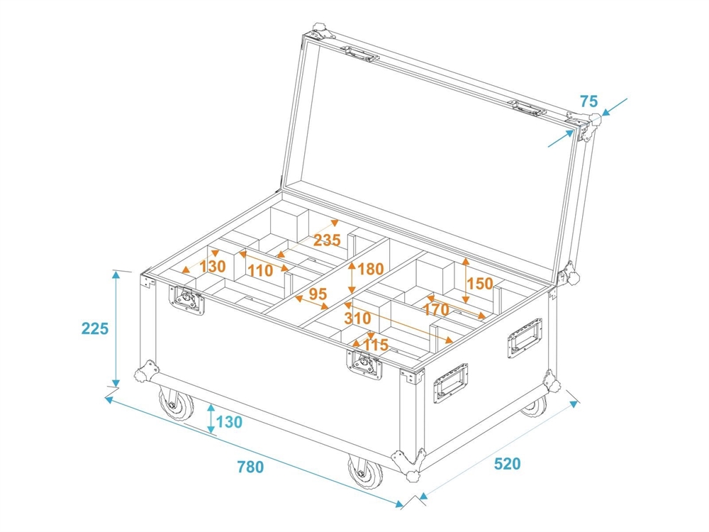 Her er du: Disconetto » Flightcase » Flightcases » Special Cases ROADINGER Flightcase 4x THA-40 PC with wheels På lager På lager, 3-5 hverdage Bedømmelse for ROADINGER Flightcase 4x THA-40 PC with wheelsProduktet er endnu ikke bedømt 4.399,00DKK ved 1 stk. Vis uden moms Trustpilot PRO flightcase with castors for 4 THA-40 PC ROADINGER Flightcase 4x THA-40 PC with wheels PRO flightcase with castors for 4 THA-40 PCWith accessory compartmentWith 4 Device compartmentsHigh-quality workmanship with birch multiplex 7 mm, dark brown, laminatedInterior with foam paddingAluminum profile frames 25mm with rounded edges4 hinged, chromium plated case handles2 chrome tip-over locks2 high-quality butterfly locks4 castors with 2 locking brakes4 built-in stacking trays in the coverMade in EuropeFor further information about this product, please refer to the Data Sheet under "Downloads" Maximum load:100 kgAluminum profile frames:25 mmCase handles:4 pc/pcsStop hinge:2 pc/pcsLock:Butterfly lock: 2 pc/pcsTransport aid:4 x castors with 2 locking brakes4 x built-in stacking trays in the coverMaterial:Birch multiplex, 7 mmColor:Dark brown, laminatedDevice compartment:31 cm x 13 cm x 15 cmAccessory compartment:9,5 cm x 47 cm x 18 cmInside dimensions:71,5 cm x 47 cm x 18 cmDimensions:Width: 78 cmDepth: 52 cmHeight: 42,5 cmWeight:17,40 kg Varenr.: E-31005104