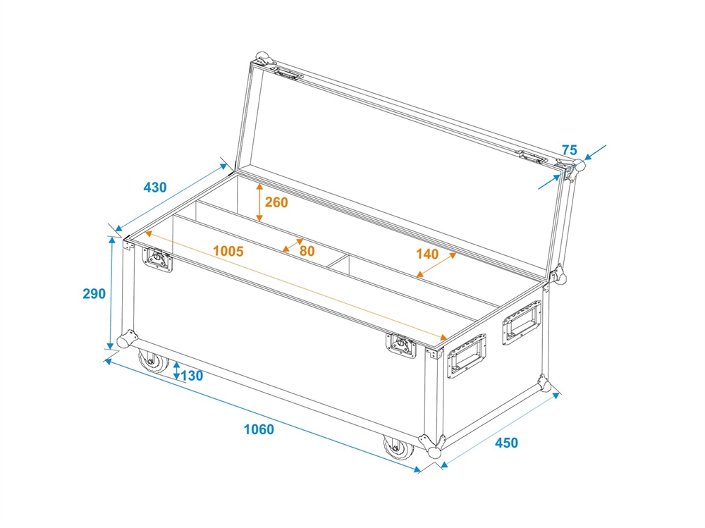 Her er du: Disconetto » Flightcase » Flightcases » Special Cases ROADINGER Flightcase 2x LED TMH Bar-S120 with wheels På lager På lager, 3-5 hverdage Bedømmelse for ROADINGER Flightcase 2x LED TMH Bar-S120 with wheelsProduktet er endnu ikke bedømt 3.069,00DKK ved 1 stk. Vis uden moms Trustpilot Trunk case with castorsROADINGER Flightcase 2x LED TMH Bar-S120 with wheelsDenne vare kan KUN sendes kun med fragtmand Trunk case with castorsWith 2 Device compartmentsWith 2 accessory compartmentsInterior with foam paddingcover with foam paddingAluminum profile frames 30mm with rounded edges2 chrome tip-over locks2 high-quality butterfly locks4 castors with 2 locking brakes4 built-in stacking trays in the coverFor further information about this product, please refer to the Data Sheet under "Downloads" Maximum load:100 kgAluminum profile frames:30 mmStop hinge:2 pc/pcsLock:Butterfly lock: 2 pc/pcsTransport aid:4 x castors with 2 locking brakes4 x built-in stacking trays in the coverMaterial:Plywood multi-layer gluedColor:Black, laminatedDevice compartment:1 m x 14 cm x 30 cmAccessory compartment:49,5 cm x 8 cm x 30 cmInside dimensions:1 m x 40 cm x 30 cmDimensions:Width: 1,06 mDepth: 45 cmHeight: 49 cmWeight:21,45 kg Varenr.: E-31001071 Vi anbefaler Eurolite LED TMH Bar S120 Moving-Head Spots, 4 individuelt styrbare 30 W bevægelige hoveder, gobo- og farvehjul DKK 8.199,00