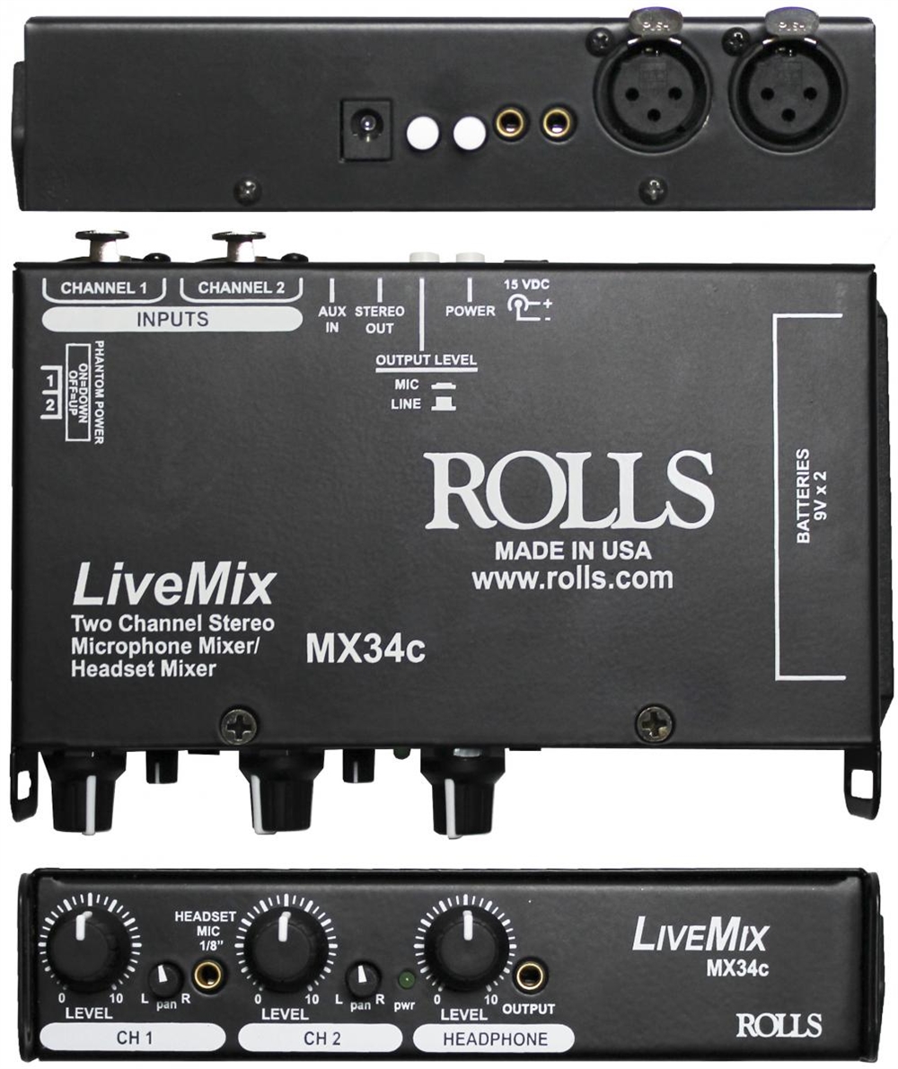 The MX34c LiveMix - two channel microphone mixer. Although having many uses, this little mixer was originally designed with the video camera operator in mind. The MX34c is a two channel microphone mixer with balanced XLR inputs, phantom power, and stereo 1/8" (3.5mm) outputs. The 3.5mm output may be switched either mic or line level. It has a stereo 1/8" (3.5mm) Auxiliary input for connection to any stereo line-level source such as a phone, tablet or CD player. A 3.5mm headset mic in on the front for narration. Each channel has a Level and Pan control, and a separate headphone circuit allows for monitoring all signals without effecting the main output signal. Holes for a shoulder strap, easy-access controls, and smart Input/Output jack placement make the MX34c ideal for the live recording enthusiast.