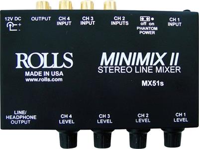 4-kanals mixer. Mixer signalerne fra 1 XLR-mikrofonindgang (med phantomspænding), 1 RCA/3,5mm-indgange og 2 RCA-indgange.
