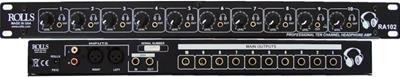 The RA102 is 10ch headphone amplifier that can be ganged together for as asmany channels as desired. It has 1/8" stereo outputs on the front and 1/4" outs on the rear for installations all in a 1U space