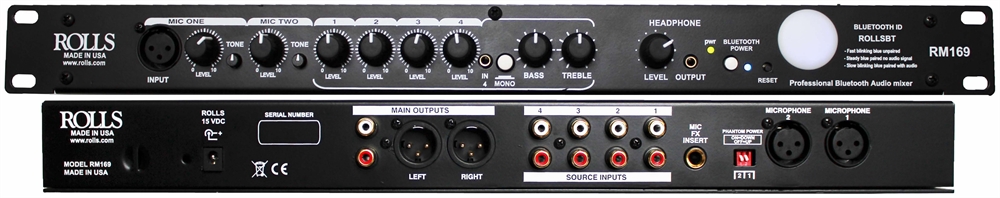 The RM169 is a six channel Professional audio mixer with Bluetooth input. Two microphone inputs, and four stereo line RCA inputs, the RM169 is ideal for any installation where space is a consideration, without compromising audio quality. The Bluetooth input has extended range and exceptional audio quality. RCA and XLR balanced outputs jacks make the RM169 perfect for any application.