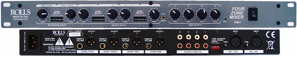 Rackmonterbar 4-zones mixer til 2 mikrofoner og 4 line-kilder. Hver lydkilde kan kobles til valgfri kombination af fire zoner.