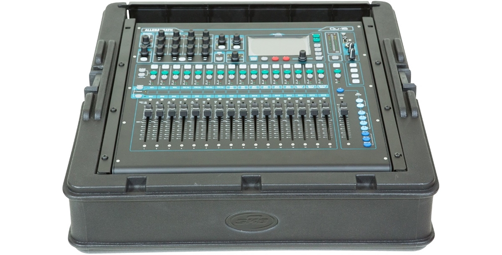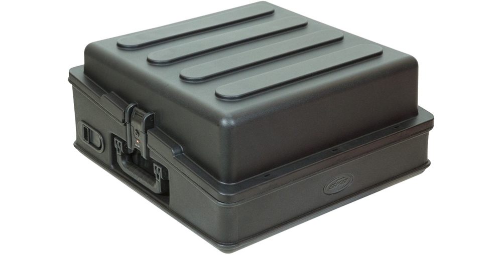The 1SKB-R100 is a 10U slanted top rack mixer case that features steel threaded rails, a hard lid and a removable rear door for maximum access to the rack gear, side access ports (for cable routing) on each side with a comfortable rubber over-molded handle on each side for easy carrying.
