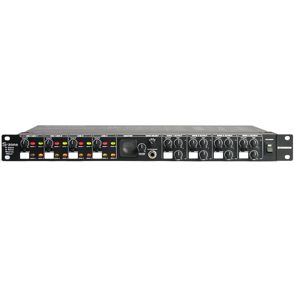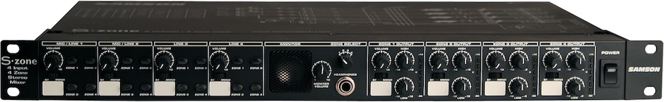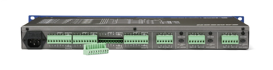 4-kanals installationsmixer med 4 stereo zoner. Alle indgange kan assignes frit til en eller alle zoner.