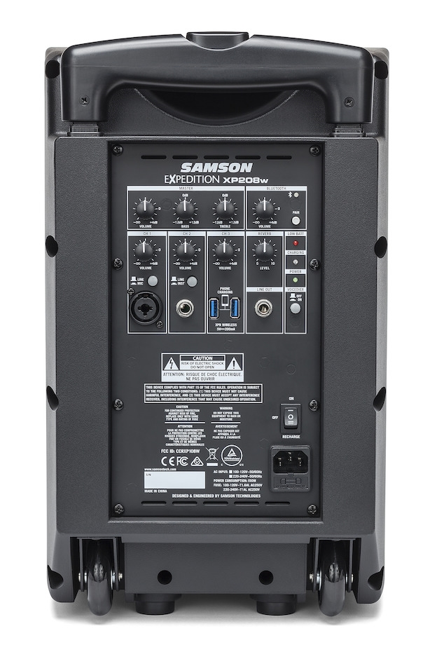 All of this is housed in a rugged polypropylene enclosure with a steel grille, telescoping handle and smooth rolling wheels that weighs just under 24 pounds. Needless to say, transporting the XP208w is a breeze. Plus, a 1 3/8" speaker mount allows the XP208w to be mounted using any standard speaker stand.