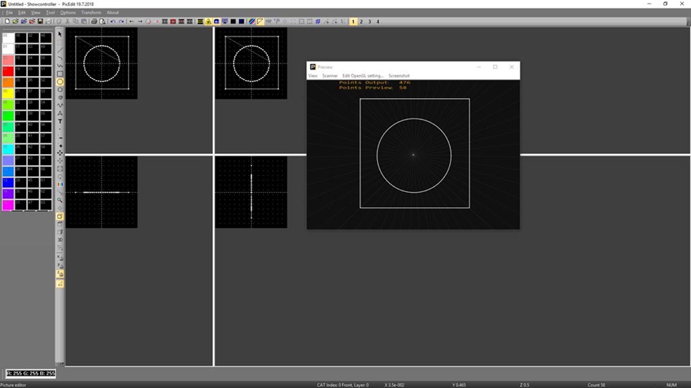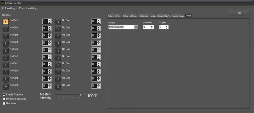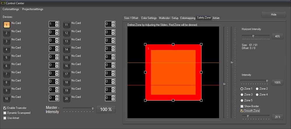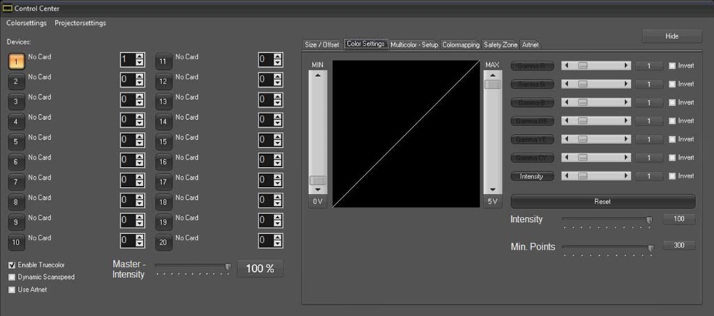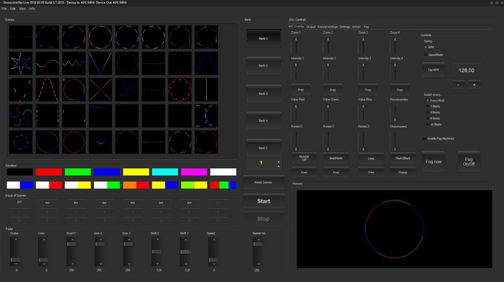 Showcontroller LIVE er et ekstremt kraftfuldt værktøj: 40 scener kan forindstilles per bank, og 10 banker kan anvendes til dette. Derudover kommer Showcontroller LIVE allerede med et stort udvalg af allerede forindstillede scener, så det er meget nemt at komme i gang med et lasershow: