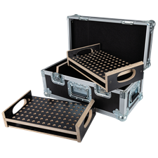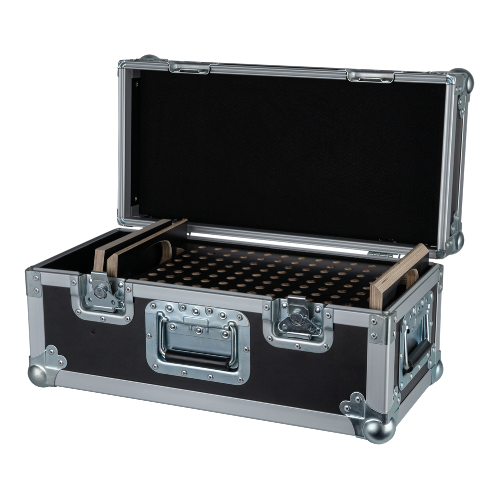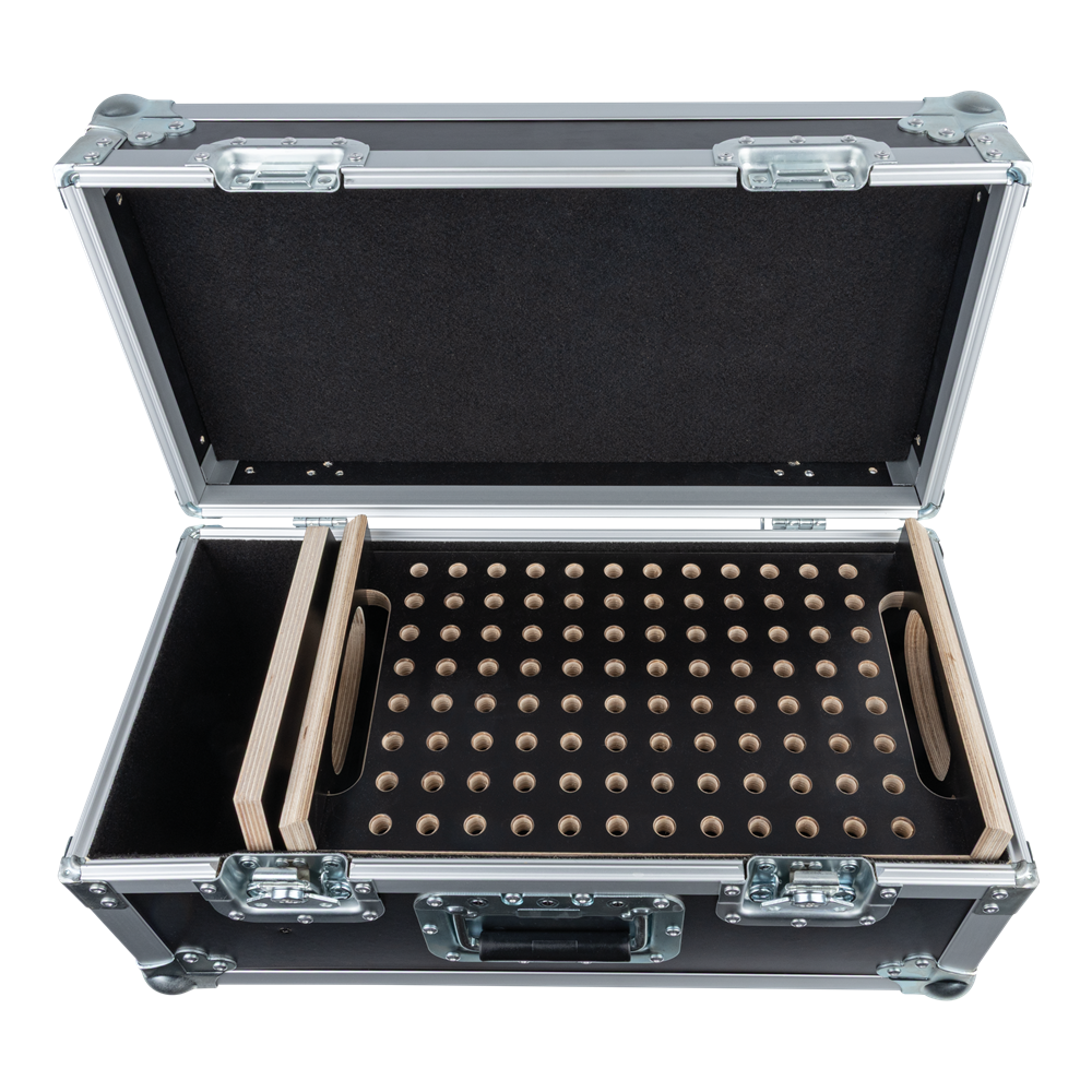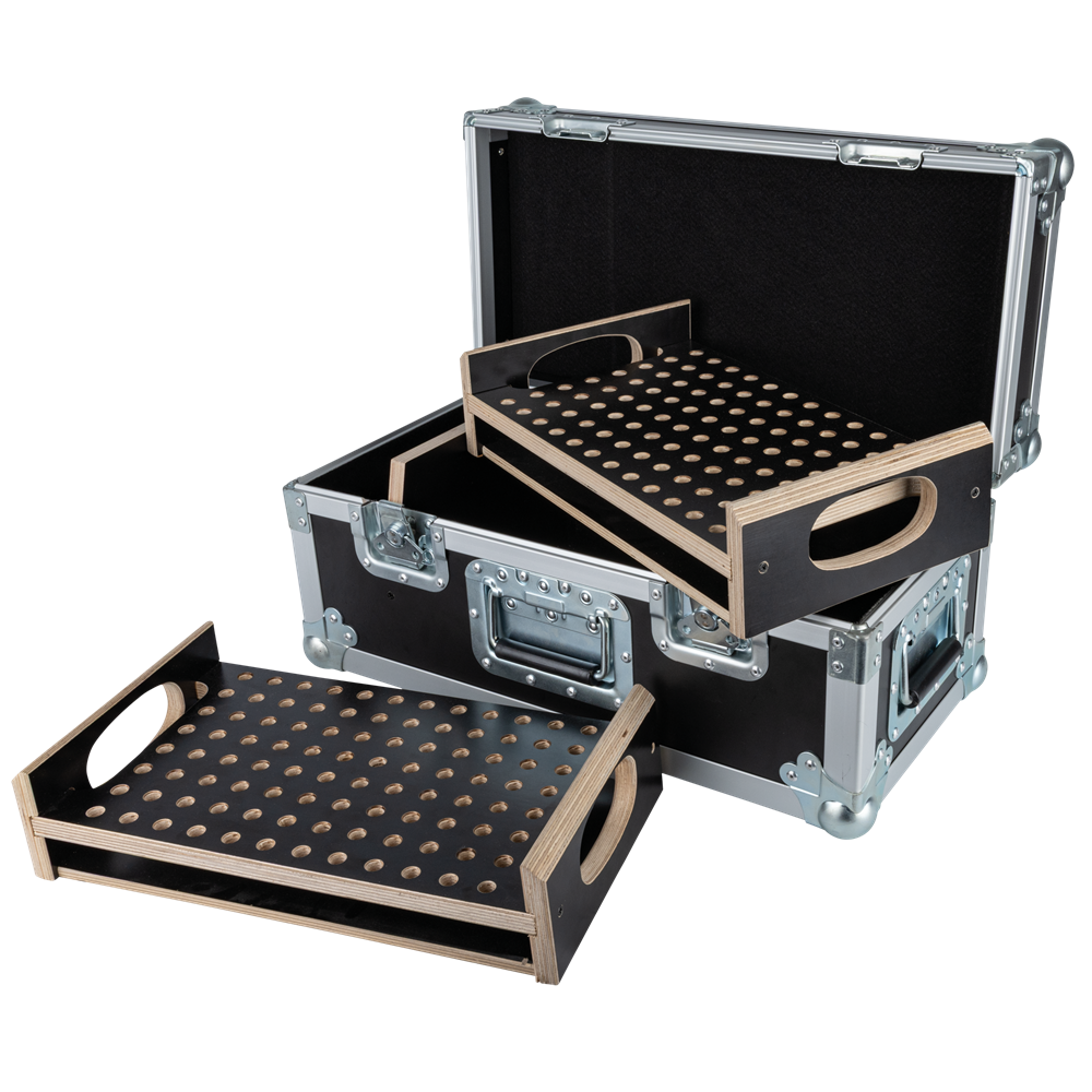 The Showgear Conical Adapter Case 2 is designed to hold up to 192 pins, offering a clear and organised solution for rigging setups. It gives you an instant visual overview and makes it easy to spot missing parts before heading out or during teardown (pins not included). By streamlining your workflow and reducing the risk of forgotten items, this case saves valuable time and prevents frustration when building or dismantling a truss system. Built with professional-grade Penn Elcom hardware, it ensures long-lasting durability and ease of use. A small additional compartment offers space for extra accessories, keeping everything you need in one reliable case. The Conical Adapter Case comes with two adapter inlays.