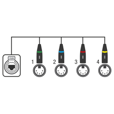 Alle fire han DMX-stik er farvekodede for nem identifikation og har en kabellængde på 75 cm. Vi anbefaler at bruge et skærmet CAT-kabel for optimale resultater.