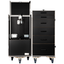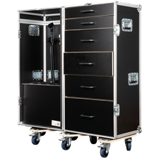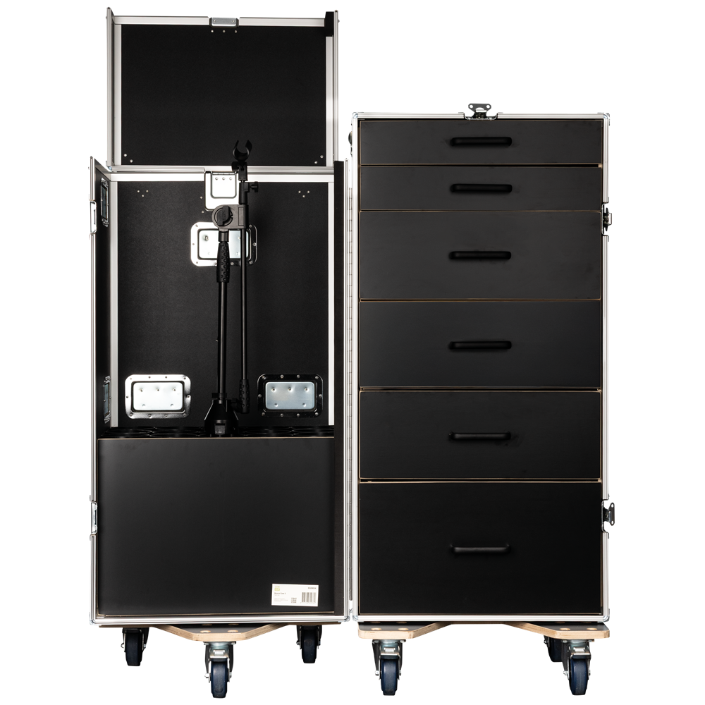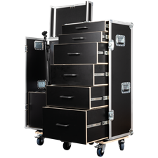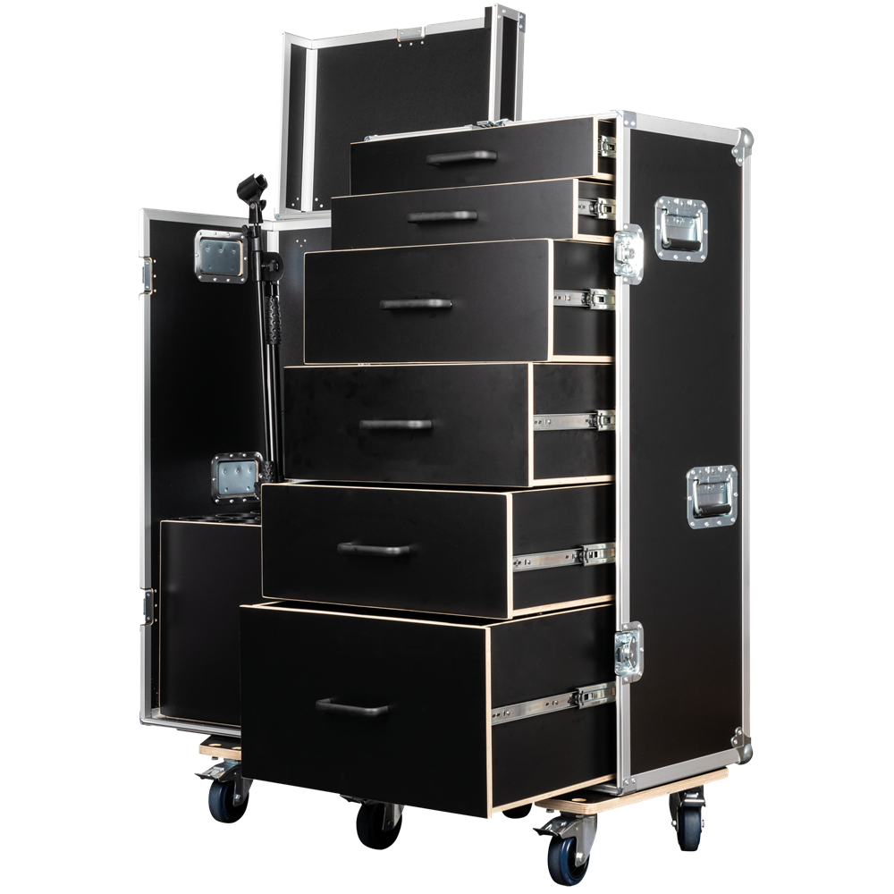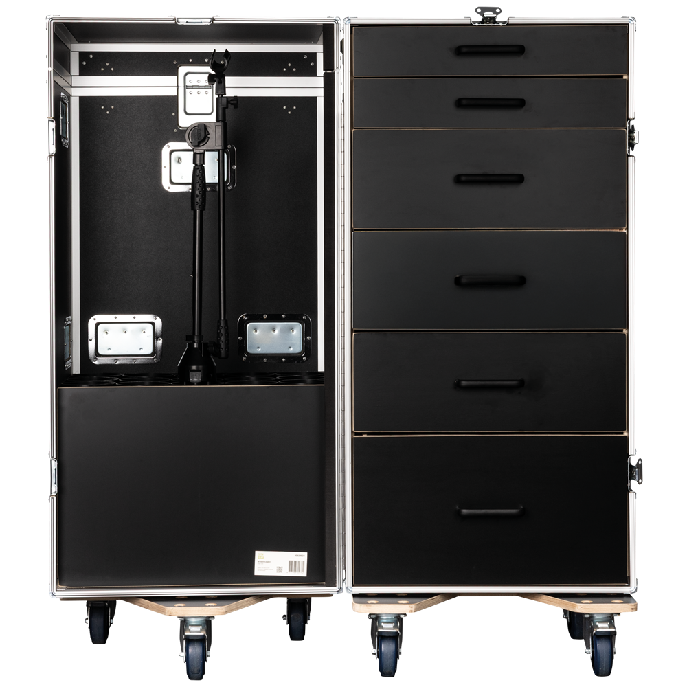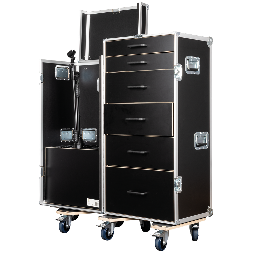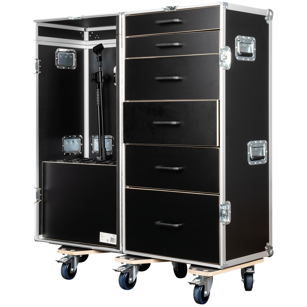 The Showgear Drawer Case 3 is a tall, multifunctional flight case designed for professionals who need both structured storage and safe transport of microphone stands. It features six drawers in the rear section, ideal for organising tools, accessories, and small equipment - and a dedicated front compartment that securely holds up to 15 microphone stands in an upright position.