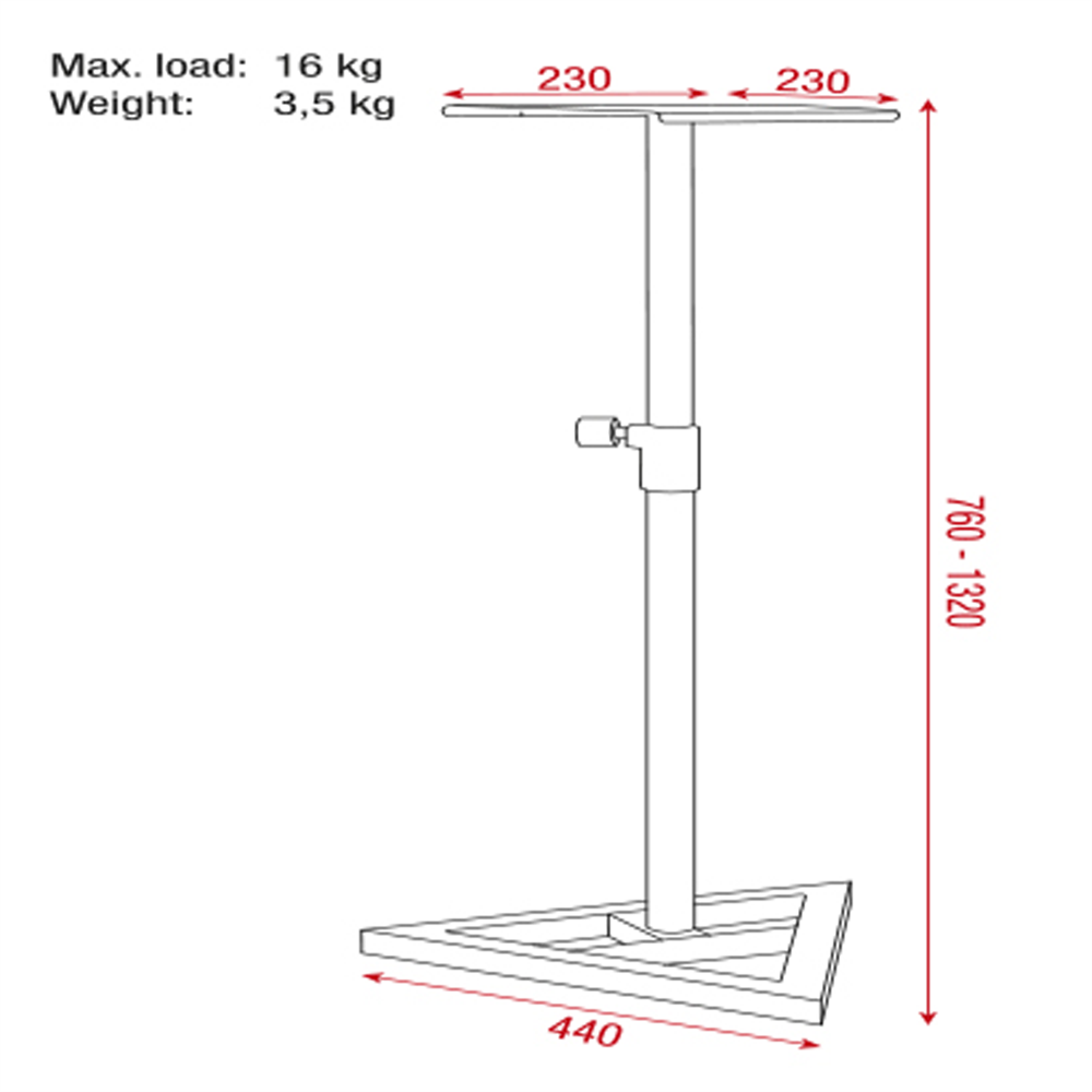 Her er du: Disconetto » Stativ, Scene & Truss » Audio Stativer » Monitor/Højtaler Stand Showgear Monitor Speaker Stand Steel - 760 -1320 mm - maks belastning 16 kg På lager 3-8 hverdage Bedømmelse for Showgear Monitor Speaker Stand Steel - 760 -1320 mm - maks belastning 16 kgProduktet er endnu ikke bedømt 349,00DKK ved 1 stk. Vis uden moms Trustpilot Minimum højde (mm)760 mmMaksimum højde (mm)1320 mmMaterialeStålVægt3.5 kgMaksimum belastning16 kgLåsetypeSkrueknopMaksimal foldet længde1.32 mm Varenr.: D8320