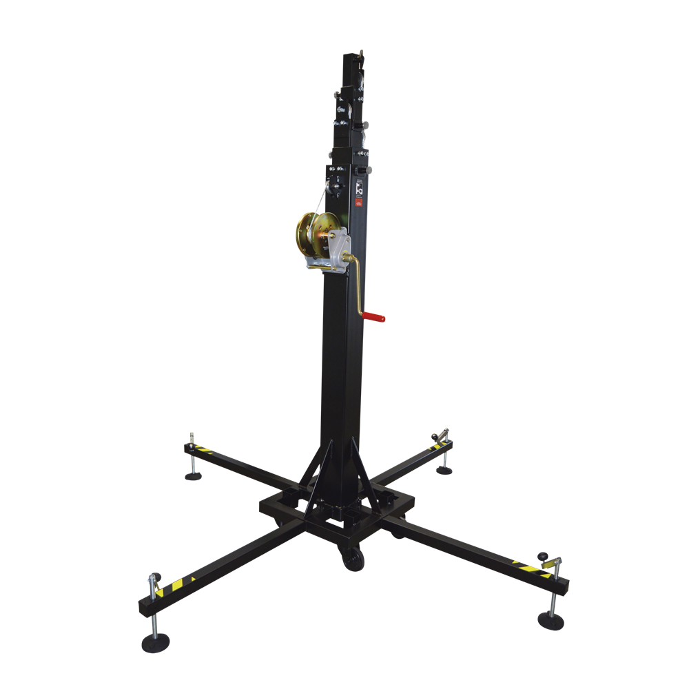 Denne wind-up stativ med aftagelige ben er perfekt til at hæve lydsystemer, belysning og truss. Den kan løfte belastninger op til 200 kg op til en højde på 6,4 meter. Sikkerhedsfunktioner inkluderer en forstærket base, automatisk låsesystem til benene, sikkerhedslåse og en cirkulær libelle, der hjælper dig med at nivellere tårnet for optimal stabilitet.