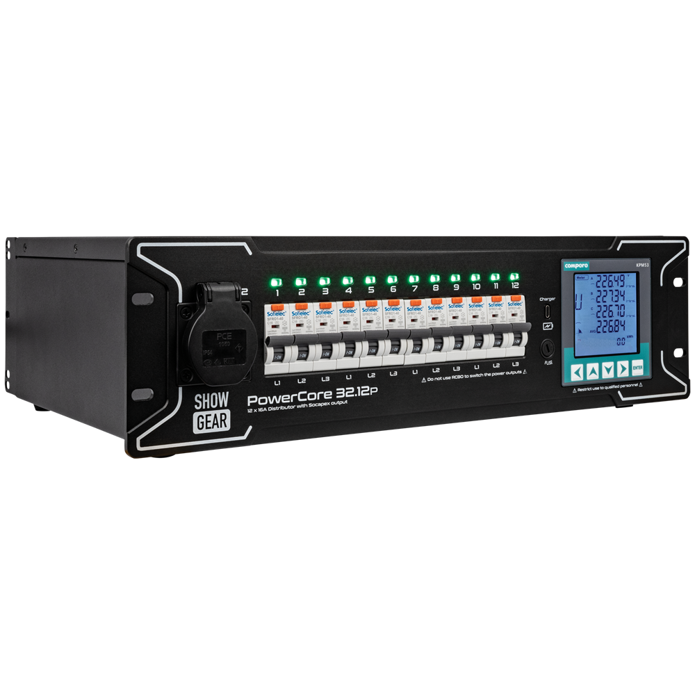 Showgear PowerCore 32.12p leverer pålidelig strøm og optimal beskyttelse til dit værdifulde udstyr. Hver udgang er udstyret med sin egen RCBO for at opdage jordfejl og overstrøm. Hvis der opdages et problem, vil den automatisk slukke for den påvirkede kreds, mens resten af systemet forbliver aktivt.
