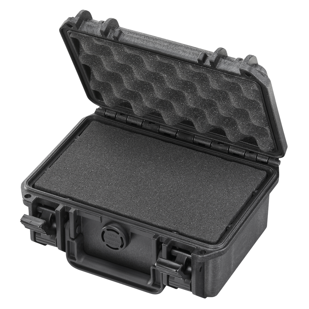 This tough case is ideal for protecting valuable equipment during storage and transportation. The included pluck foam allows customisation for a perfect fit, while the robust, double-throw latches offer optimal security and are easy to open. With an IP67 rating, the case offers effective protection against both dust and water, while the automatic pressure release valve equalises the internal air pressure.