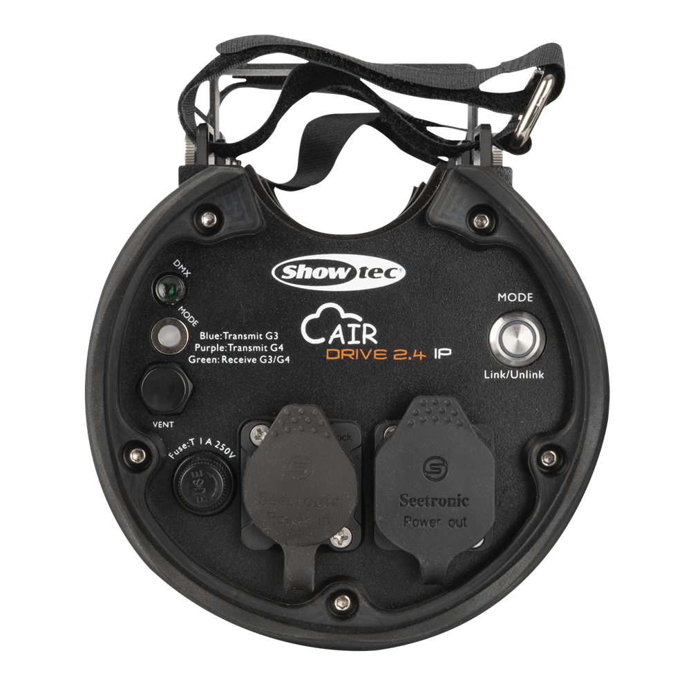 Showtec AirDrive 2.4 IP er en kompakt DMX512-transceiver, der kan skiftes mellem sender- og modtagerfunktionalitet. Den er designet til truss-montage og midlertidig udendørs brug og giver en hurtig og enkel måde at oprette en trådløs DMX512-forbindelse på. I sendertilstand kan den sende i G3- eller G4-tilstand, og i modtagertilstand understøtter den G3- og G4S-tilstand. En fungerende opsætning kræver to eller flere enheder: én konfigureret som sender og en eller flere konfigureret som modtager og parret med senderen. Der er ingen grænse for antallet af modtagere, der kan parres med senderen.