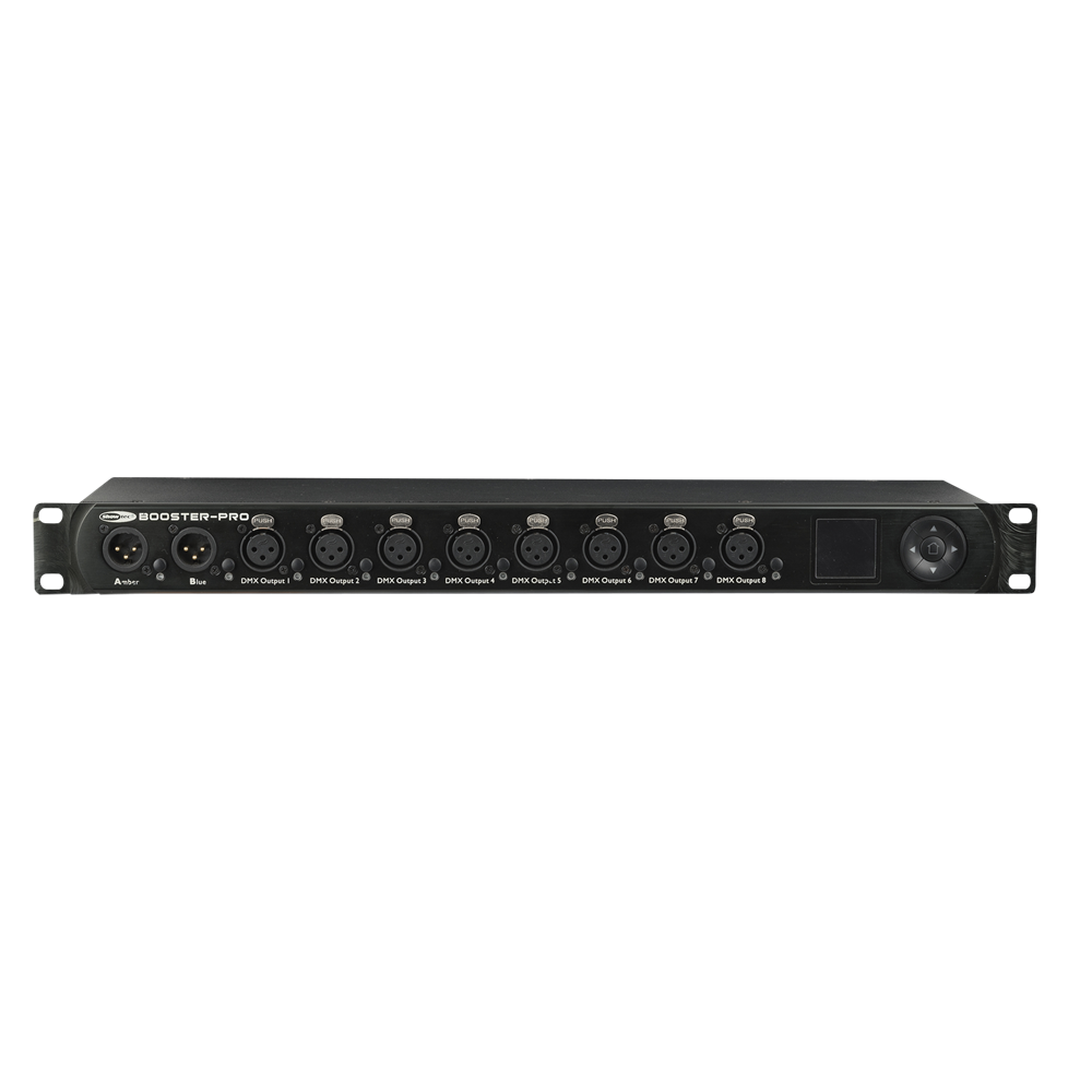 Booster Pro er det ultimative DMX-værktøj, som bør være i udstyrshylden hos hver udlejningsvirksomhed eller installation. Booster Pro er en optisk isoleret DMX-splitter og -booster. Booster Pro har 2 indgange, som kan patches til 8 valgbare udgang (for hver udgang kan du patche indgang A eller B). Booster Pro er fuldt RDM-kompatibel og tilbyder realtids DMX-overvågning. Til specialistapplikationer kan DMX-timing justeres. Desuden har hver udgang af Booster Pro en overvågningsfunktion, der kontrollerer status for de tilsluttede kabler i realtid. I tilfælde af en fejl vil et akustisk signal advare brugeren. Det intuitive OLED-display gør det nemt og hurtigt at indstille alle de forskellige funktioner.