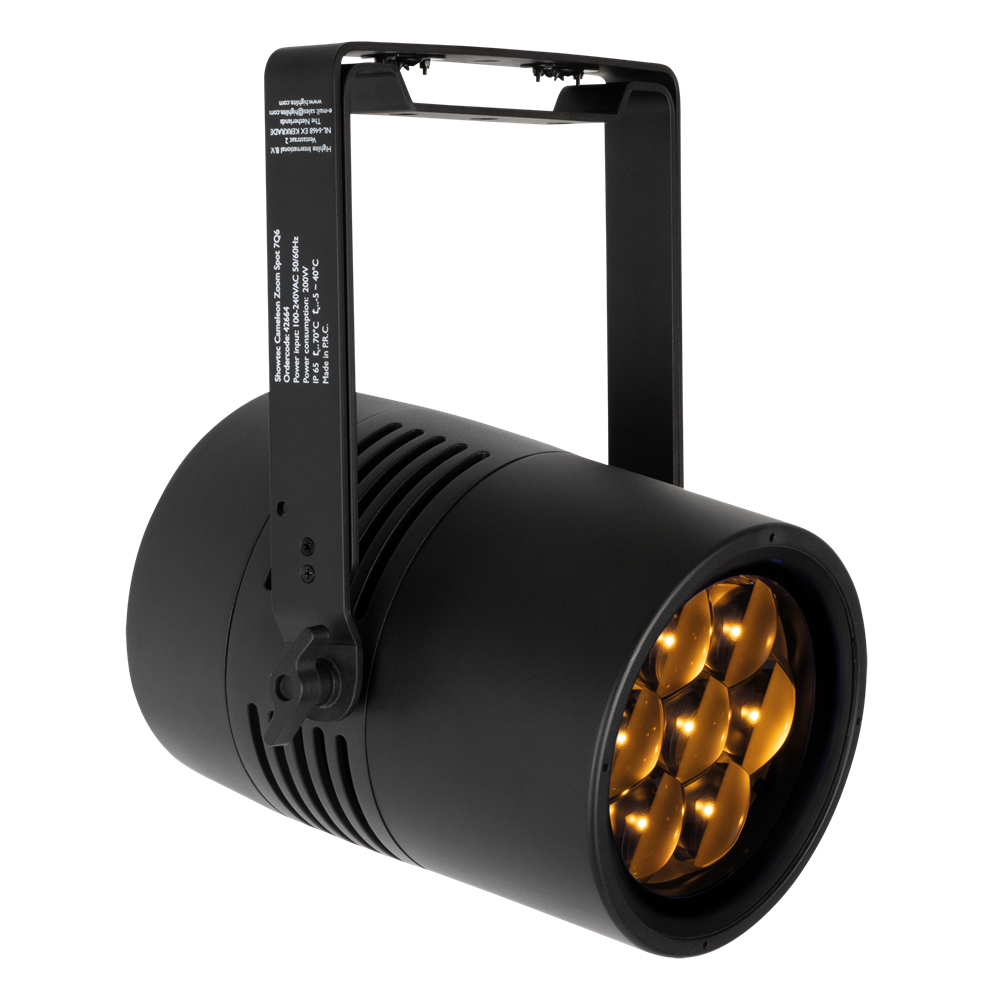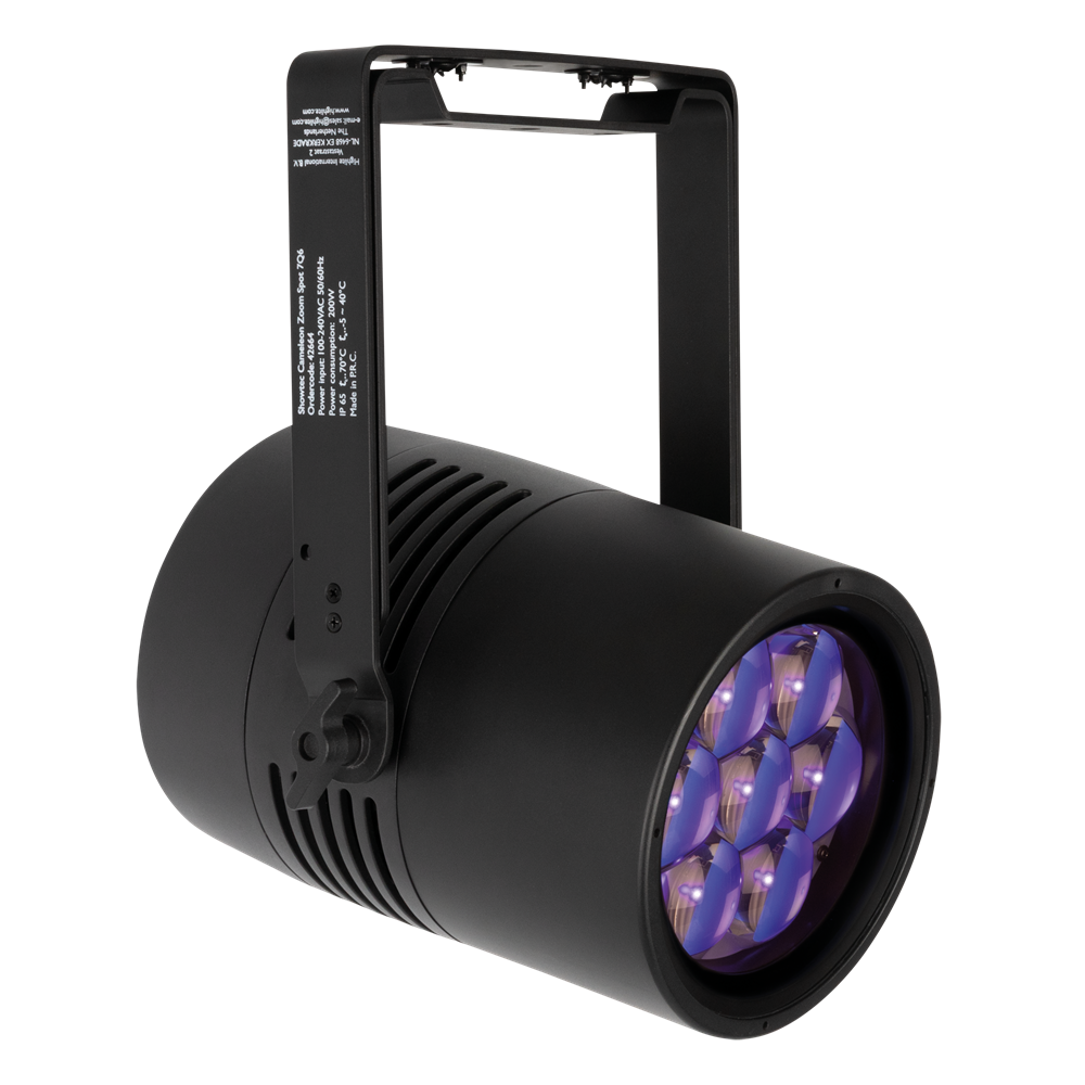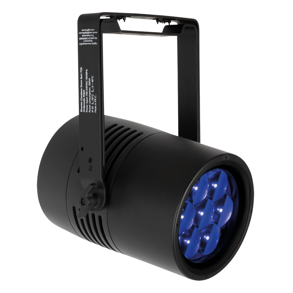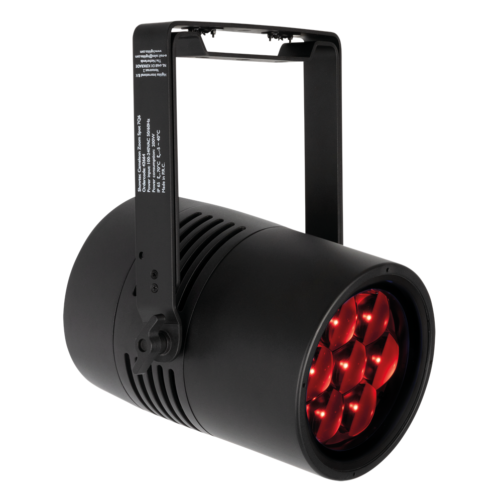The Cameleon Zoom Spot 7Q6 Tour is an LED Spot with seven 50-watt RGBWA-UV LEDs. It has a motorised zoom range from 6° to 45° and features 0–100 % dimmer control and 0–20 Hz strobe effects. With preprogrammed colours, built-in colour macros and 4 selectable dimming curves, it's easy to use. Adjustable PWM frequencies allow flicker-free filming too. The fixture can be controlled with DMX (incl. RDM) or operated in Auto or Master/Slave modes. Manual control is also possible using the OLED display and touch buttons. The fixture, the 3-pin XLR and the Seetronic Power Pro True connectors are all IP65 rated, making the Cameleon Zoom Spot 7Q6 Tour suitable for outdoor use too.