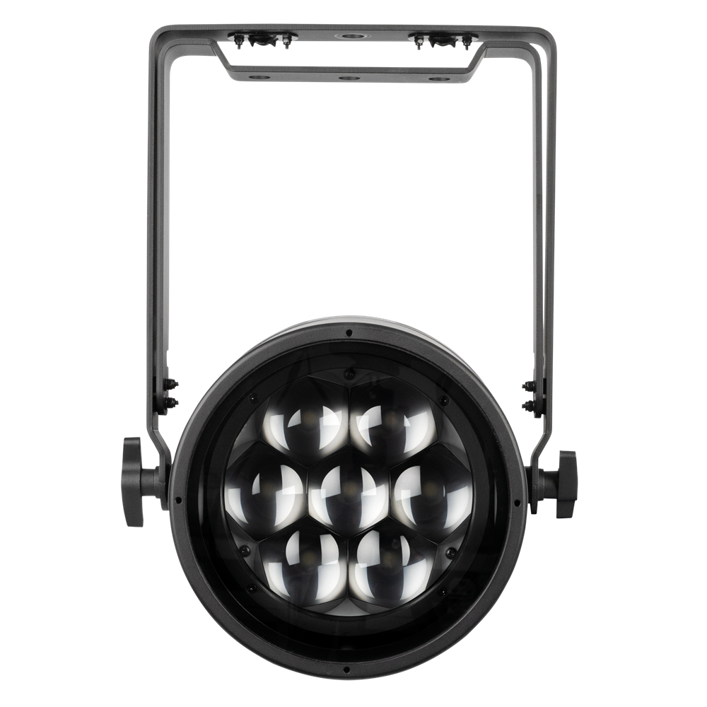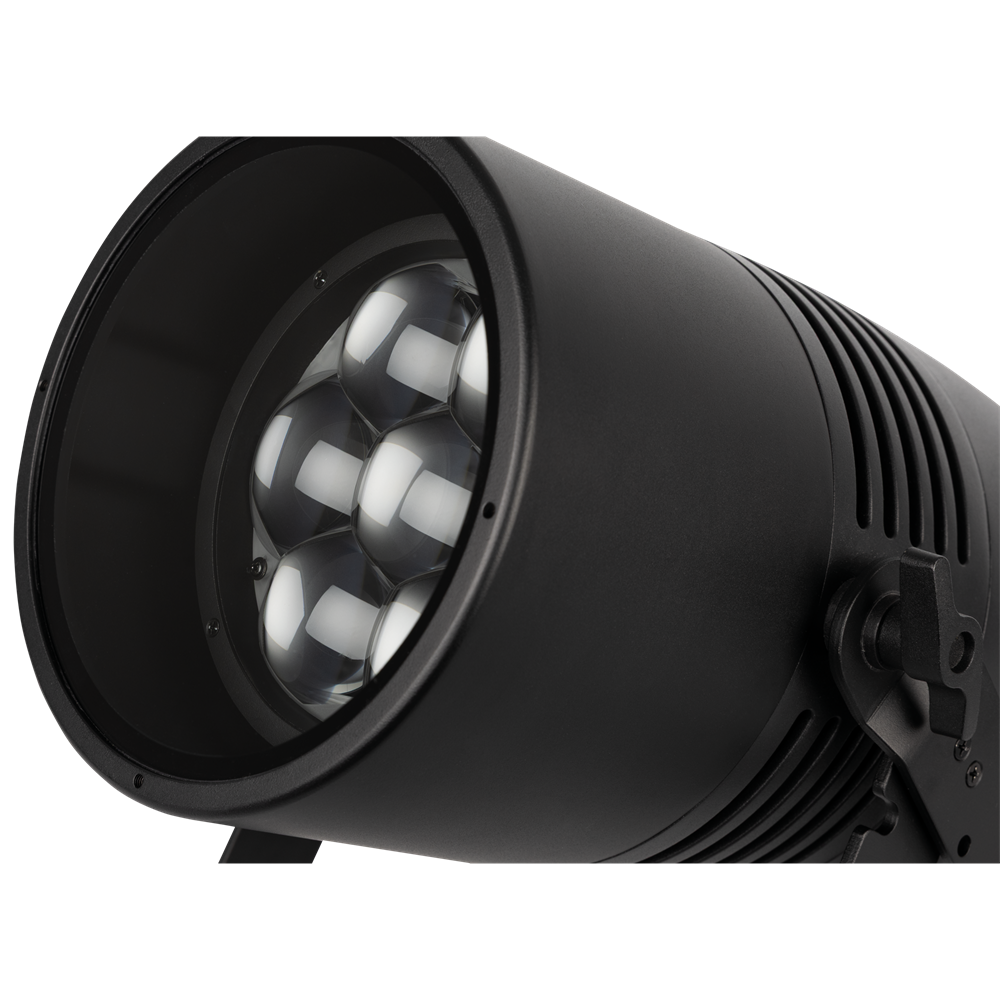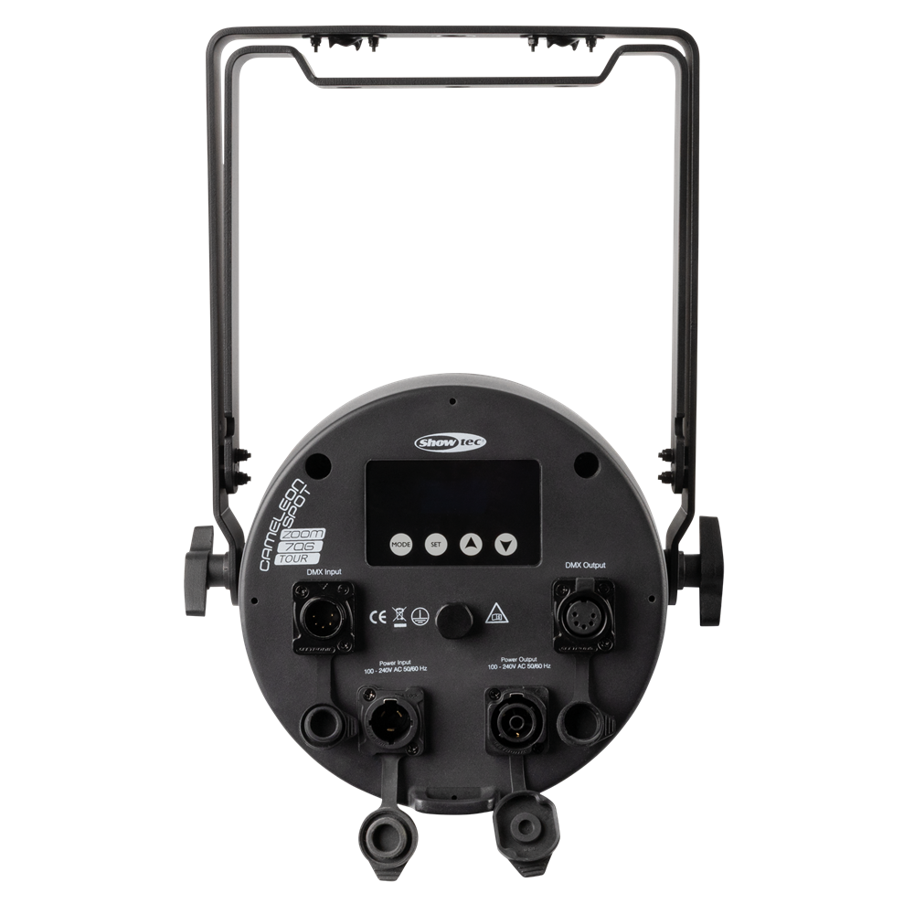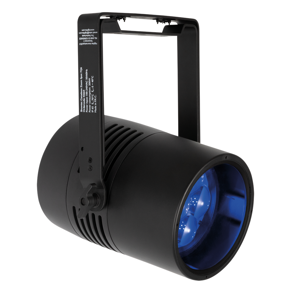 The Cameleon Zoom Spot 7Q6 Tour is an LED Spot with seven 50-watt RGBWA-UV LEDs. It has a motorised zoom range from 6° to 45° and features 0–100 % dimmer control and 0–20 Hz strobe effects. With preprogrammed colours, built-in colour macros and 4 selectable dimming curves, it's easy to use. Adjustable PWM frequencies allow flicker-free filming too. The fixture can be controlled with DMX (incl. RDM) or operated in Auto or Master/Slave modes. Manual control is also possible using the OLED display and touch buttons. The fixture, the 3-pin XLR and the Seetronic Power Pro True connectors are all IP65 rated, making the Cameleon Zoom Spot 7Q6 Tour suitable for outdoor use too.