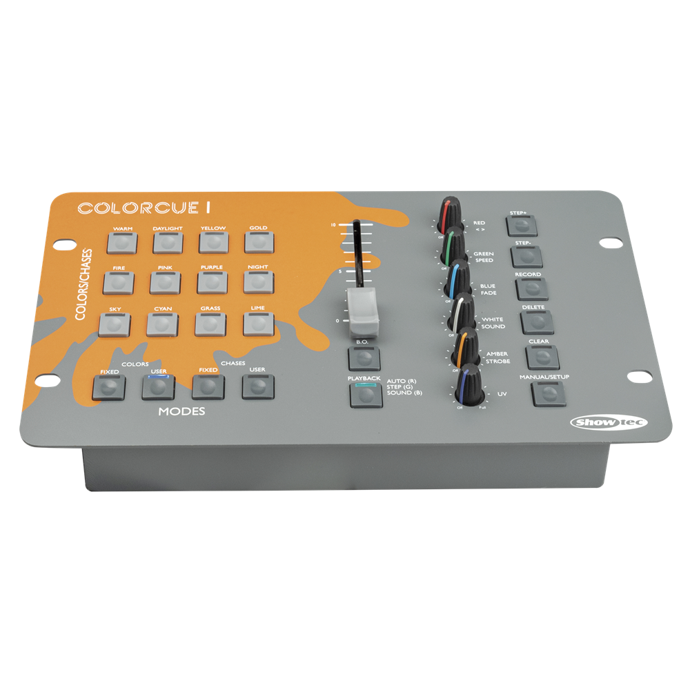 Showtec ColorCue 1 er en intelligent 1-fader LED DMX-controller med 6 kanaler til nemt at styre lys-outputtet af LED-armaturer med op til 6 farver (RGBWA-UV), passende til enhver beliggenhed. Dens 6 potentiometre gør det muligt for dig hurtigt at indstille lysene til din ønskede farve, fra 3-farve RGB til 6-farve RGBWA-UV. ColorCue 1 giver dig mulighed for at skabe dine egne 12 forudindstillede farver og du kan vælge mellem 12 faste farver. Du kan oprette op til 12 programmer (chaser) med hver op til 99 trin for at skifte farver og effekter i en løkke. Chases kan styres i manuel, automatisk drift eller lydstyret tilstand.