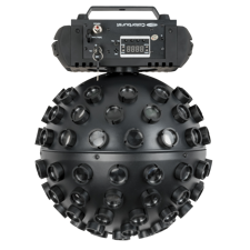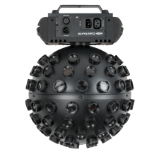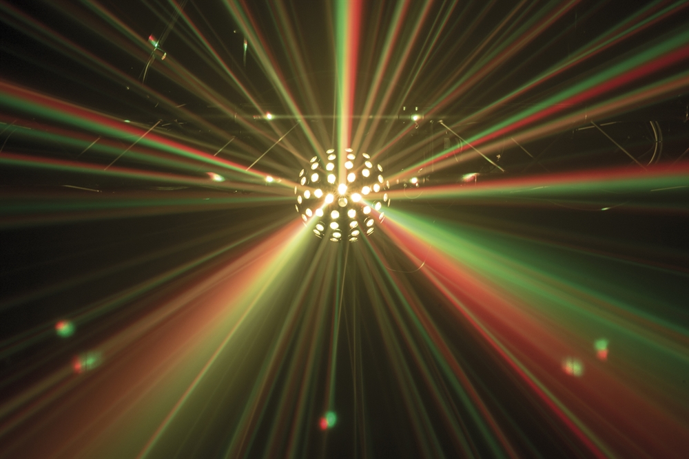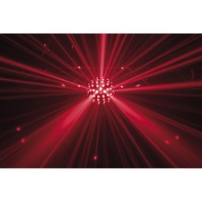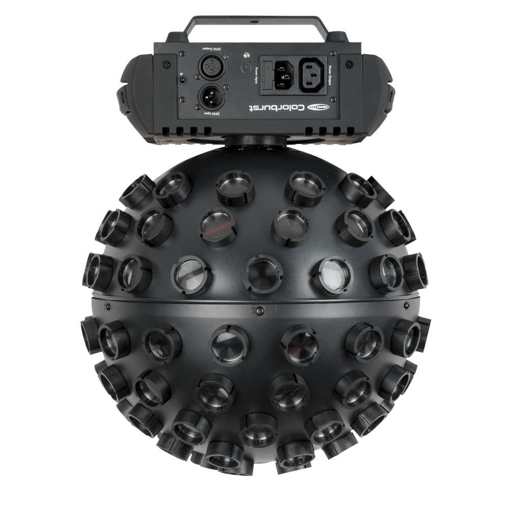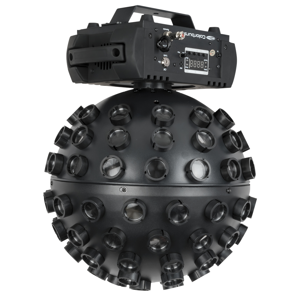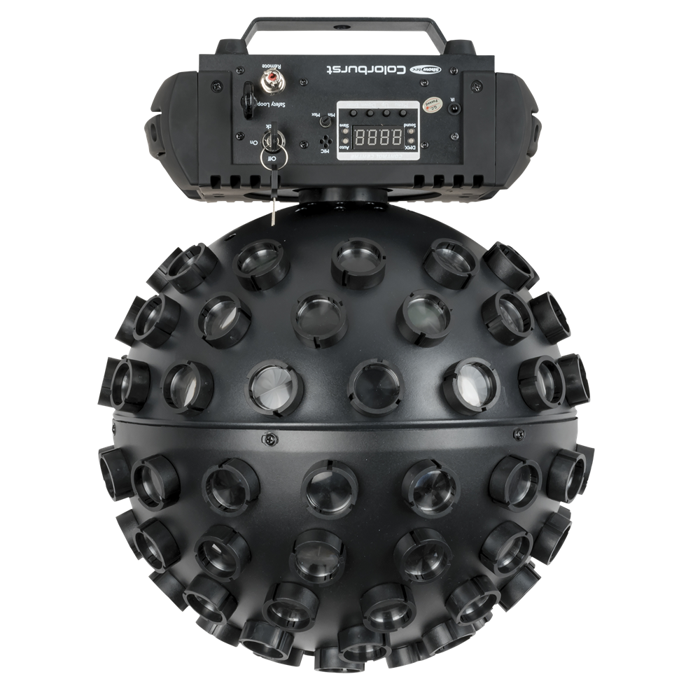Showtec Colourburst er en kraftfuld RGBW spejlkugleeffekt med integreret RG-laser. Fuld kontrol over farver i 3 sektioner, rotationshastighed og lasereffekter via DMX eller stand-alone drift. 360° dækning til at skabe romantiske atmosfærer eller dynamiske discoeffekter. Indbyggede programmer om bord, hvor både kombinerede og vekslende effekter kan anvendes i lyd- eller automode. Flere enheder kan kædes sammen med både DMX- og IEC-strømforbindelse og styres i Master/Slave-tilstand. Showtec Colourburst kan placeres opad på enhver flade eller nedad med de medfølgende ophængningsbeslag. Den medfølgende IR-fjernbetjening tilbyder nem kontrol uden behov for DMX-kontrollere.