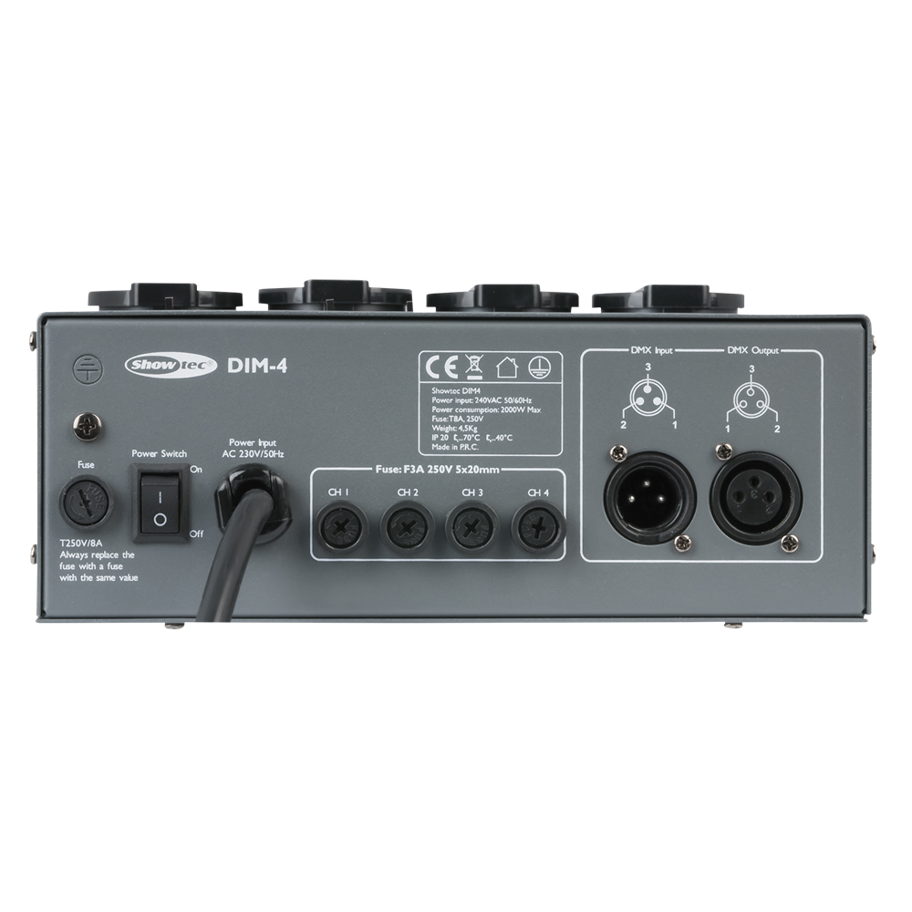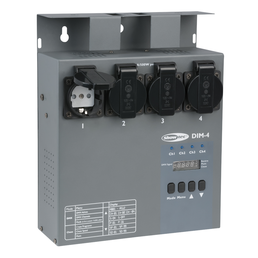 DIM-4 kan fuldt ud styres af DMX, men har også en indbygget chaser samt en lydkontrolfunktion.