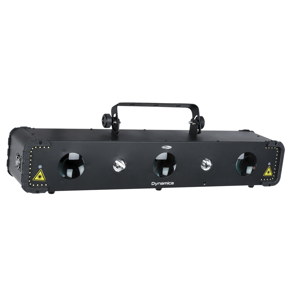 Showtec Dynamica er en alt-i-en lysteefekt. Den kombinerer RGBWA LED-beameffekter med 2 RG gitterlasere, UV-wash og 2 SMD strobe-array. Den har 2-, 5-, 8- og 10-kanals DMX-tilstande, der tilbyder grundlæggende drift og fuld kontrol over alle individuelle effekter. Indbyggede programmer ombord gør det muligt at anvende både kombinerede og skiftende effekter i lyd- eller automatisk tilstand. Flere enheder kan kædes sammen med både DMX- og IEC-strømforbindelse og styres i master/slave-tilstand. Dynamica har en ekstremt bred gulv-dækning og er den ideelle alt-i-en løsning til musikere, DJs, klubber og mobile anvendelser.