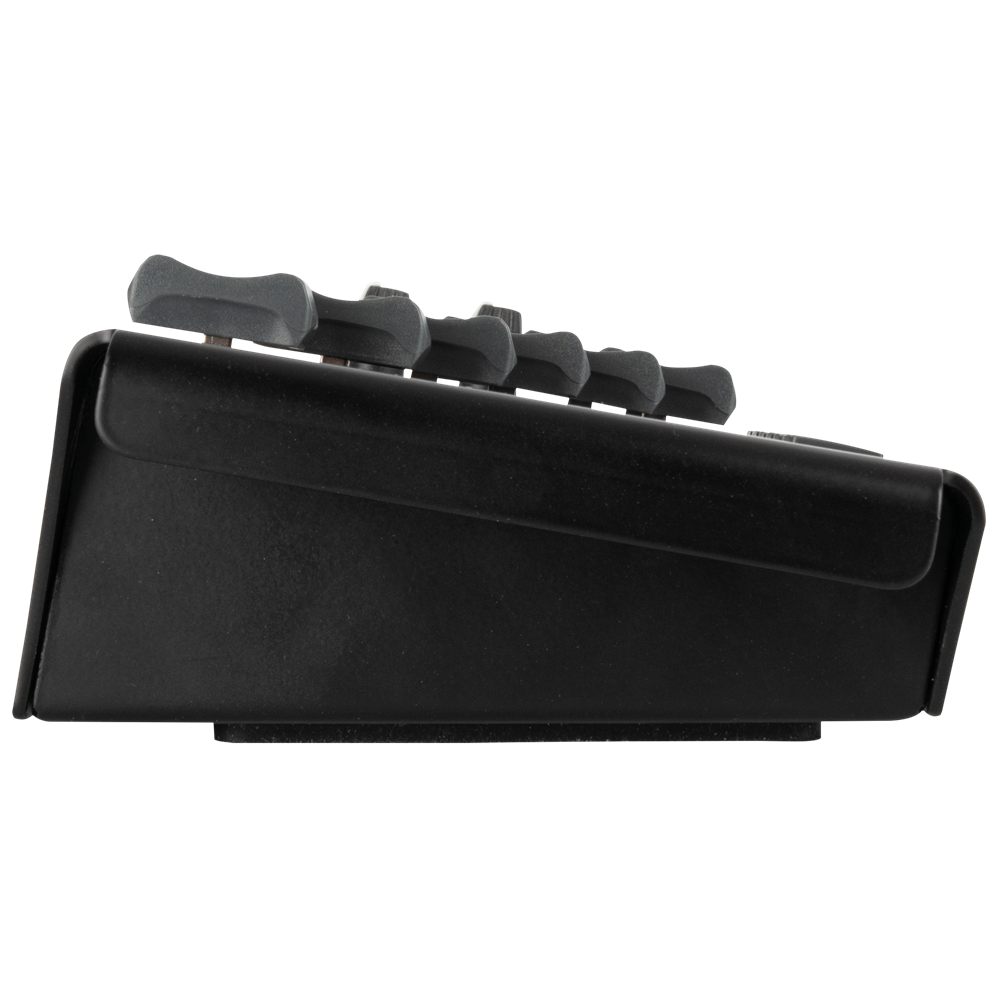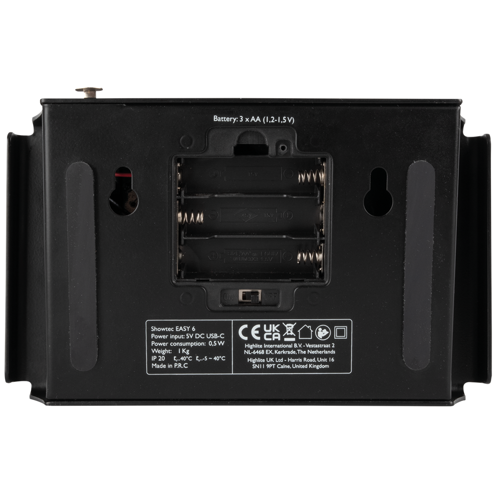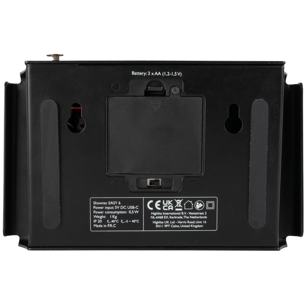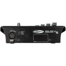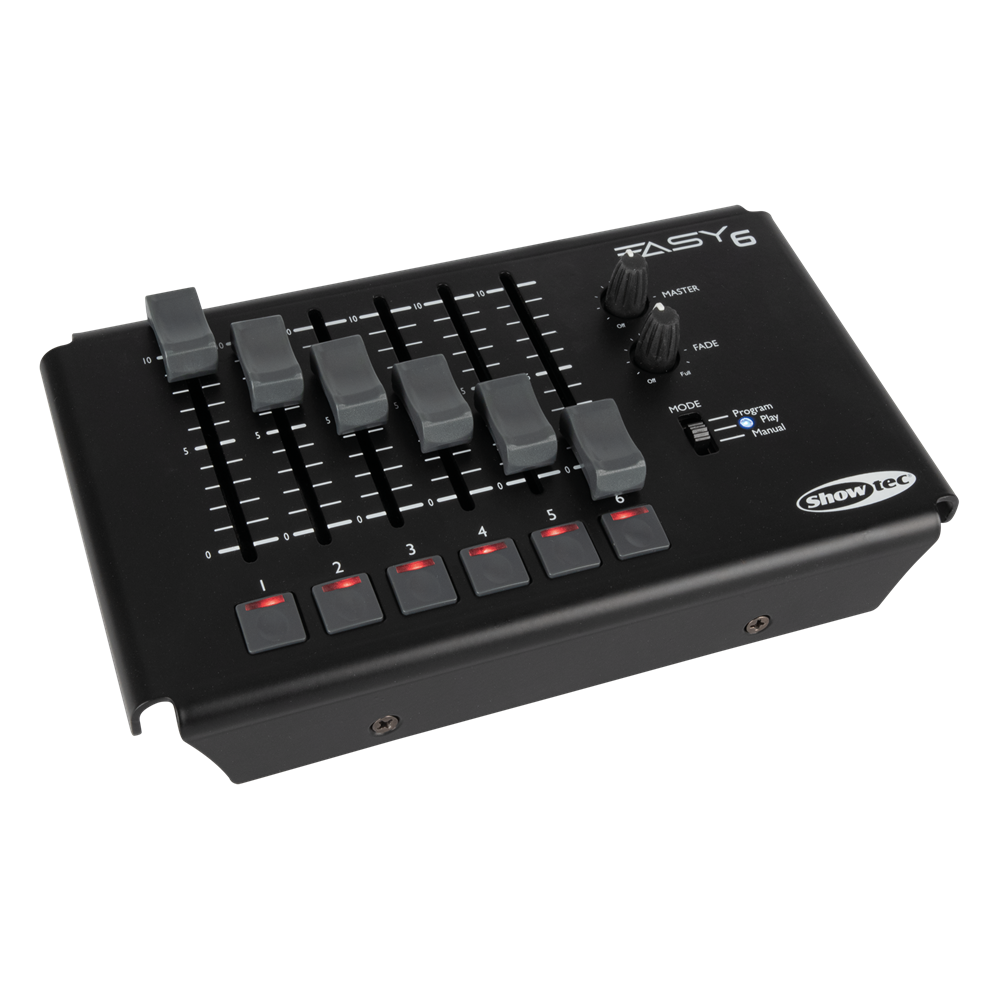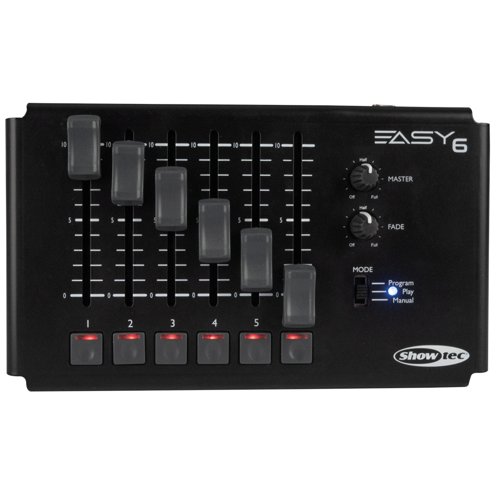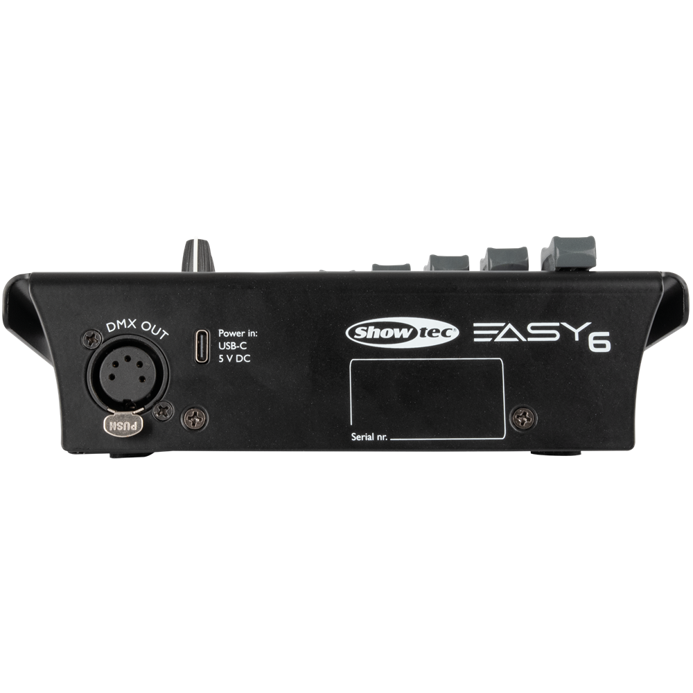 Showtec Easy 6 er en kompakt, 6-kanals DMX controller med 6 fadere, 6 knapper med integrerede LED'er, en mode-knap, en drejelig fade-knap og en master dæmpningsknap. Den er ideel til situationer med enkle lyssæt som udstillinger eller små butikker, eller til scenehold til at teste DMX udstyr. Med integrerede håndtag og 2 monteringsåbninger kan Easy 6 bruges på forskellige måder. Scener kan gemmes på hver af knapperne, og de integrerede LED'er indikerer, om en afspilningsscene er gemt på en knap eller ej. I manuel tilstand sætter faderne dæmpningsværdierne, i afspilningstilstand udgives gemte scener, når knapperne trykkes, og i programtilstand gemmes faderværdien ved tryk på en knap. Siden af controlleren har en DIP-switch, der gør det muligt at ændre startadressen for de 6 kanaler. Controlleren kan drives af USB-C eller 3 AA-batterier.