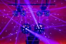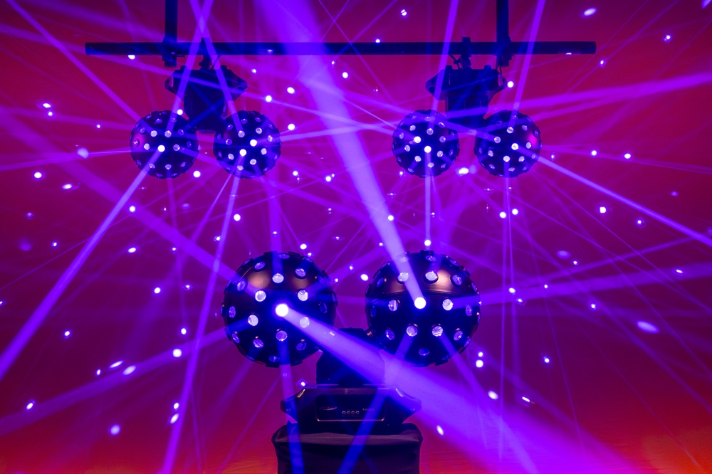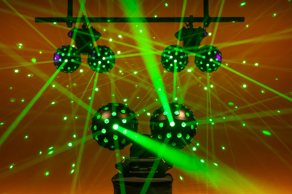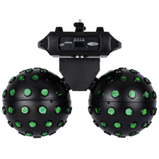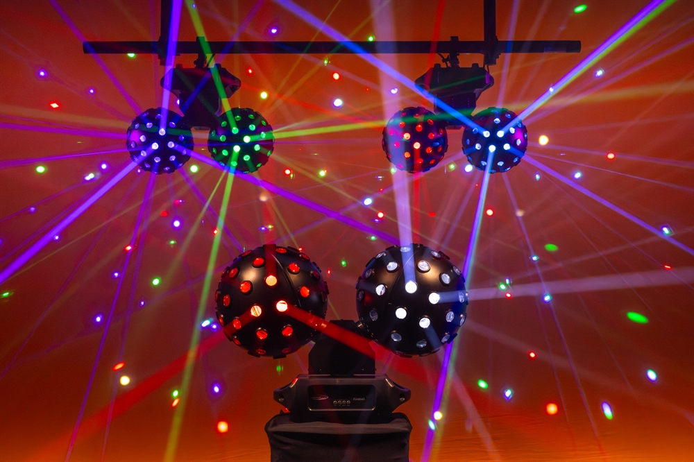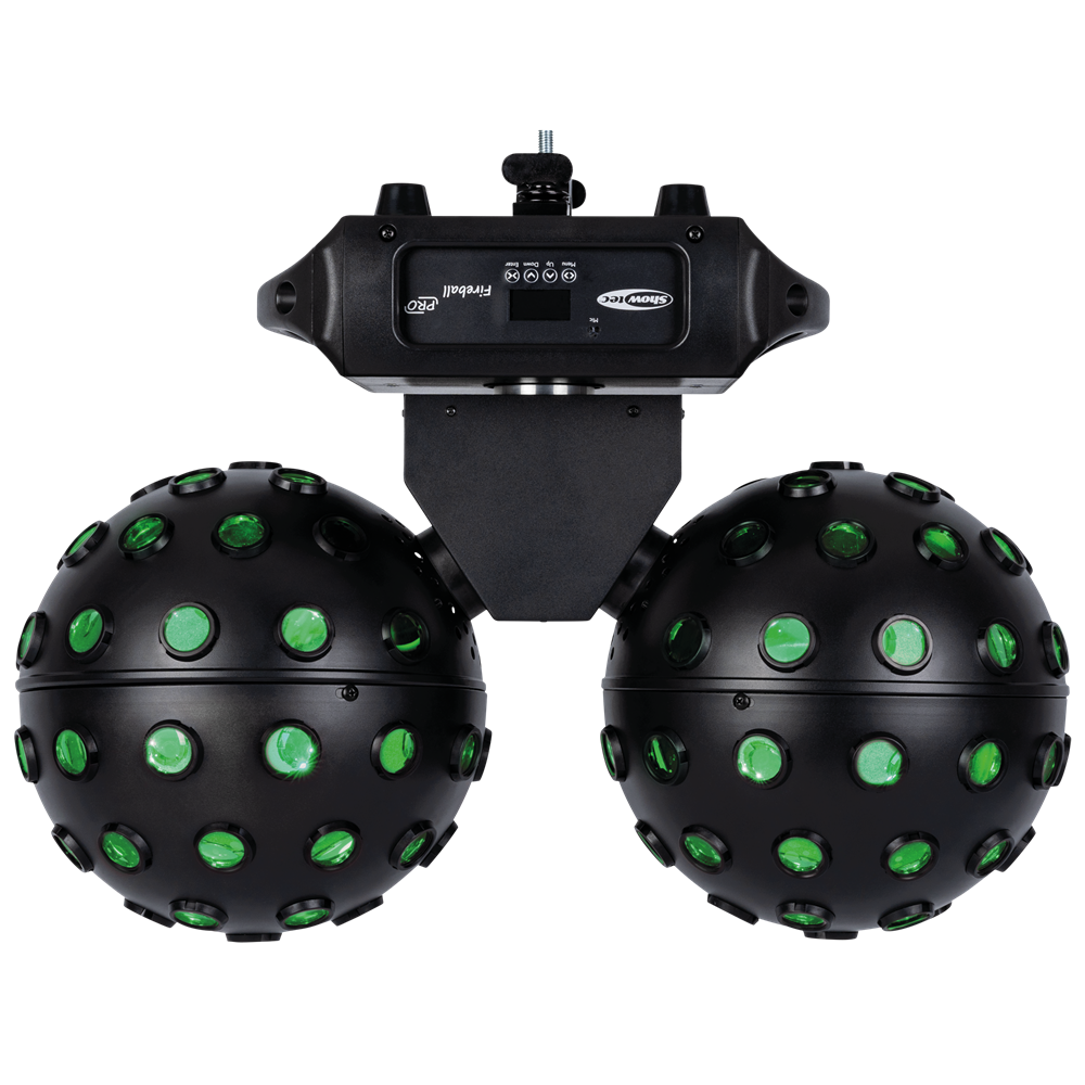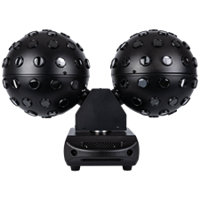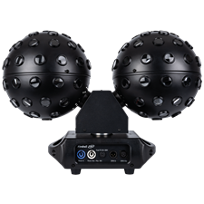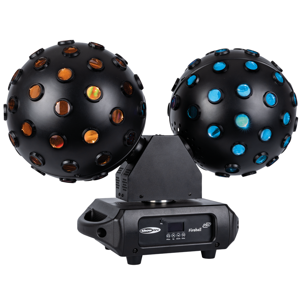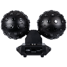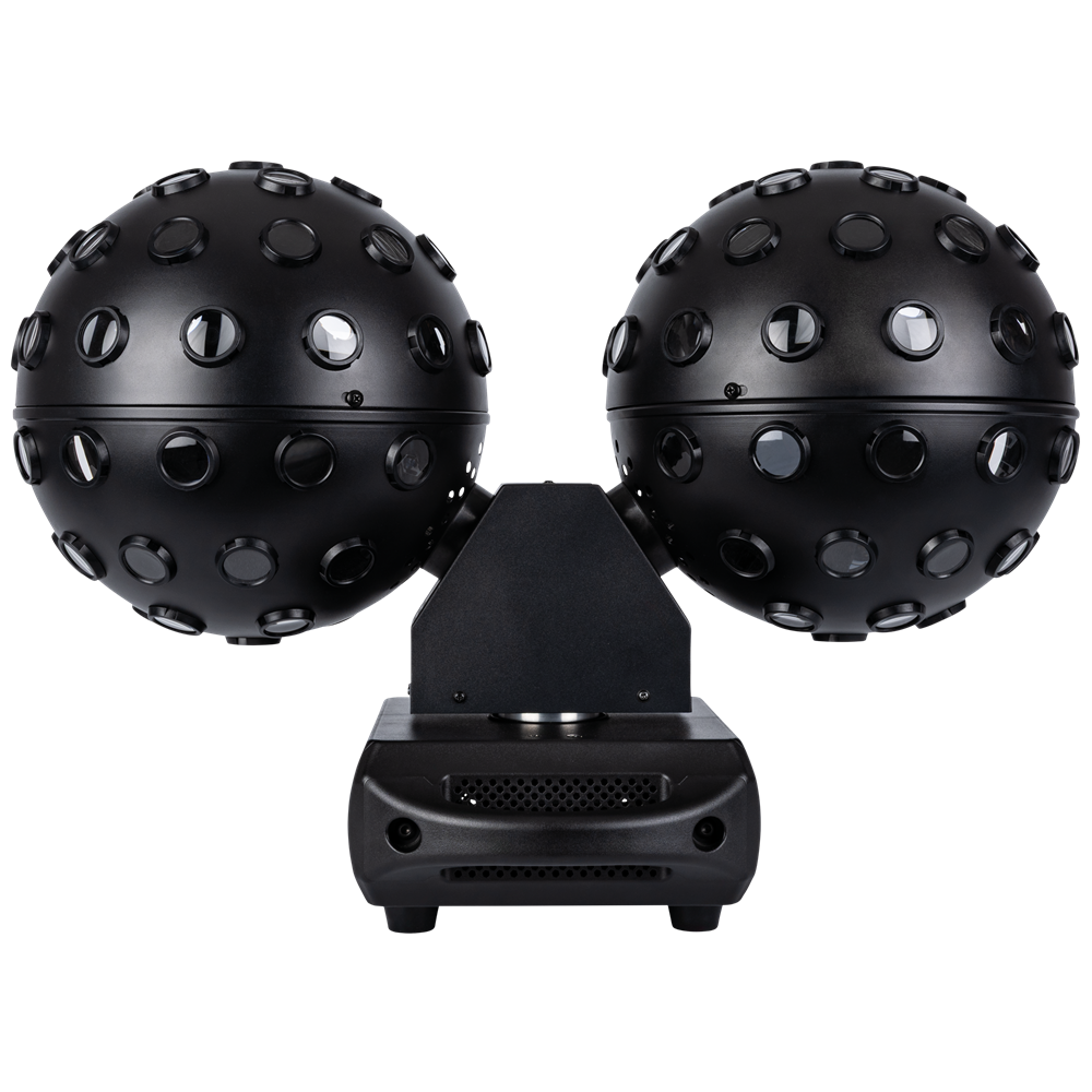 The Showtec Fireball PRO provides a powerful RGBW dual-mirror-ball-like effect. It has four 25 W RGBW LEDs in each ball, for a total of 200 W, and each ball has two independently controllable RGBW sections. Both balls rotate independently, endlessly, and bi-directionally. The carrier head can rotate bi-directionally as well. Both balls create 2-degree beams and offer 360° coverage with 57 lenses/beams each to create romantic atmospheres and dynamic disco effects.