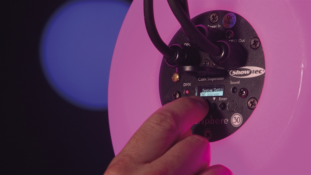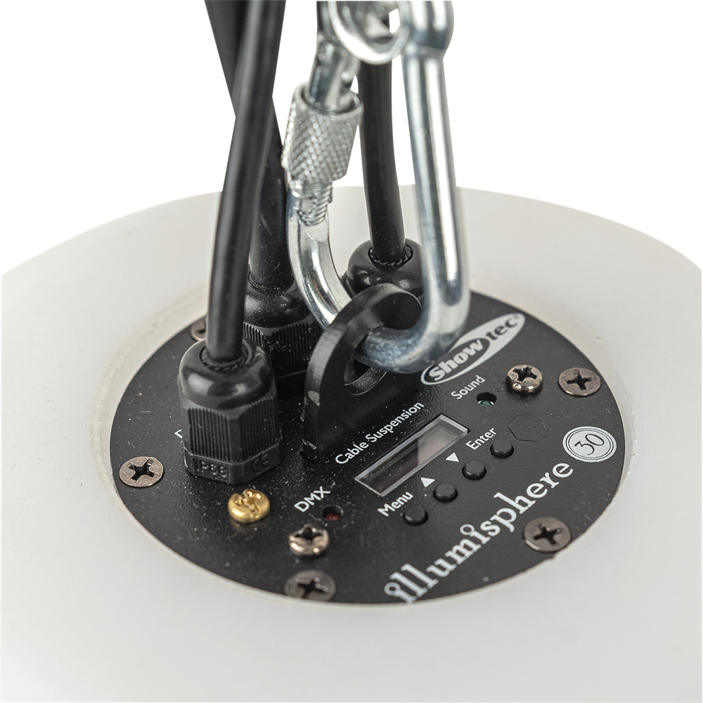 Showtec Illumisphere, tilgængelig som 30 cm (41122) og 50 cm version (41123), er en meget lysstærk RGBW LED-sfære. Den kan fungere selvstændigt ved brug af et af de tilgængelige automatiske programmer. Du kan også skabe din egen personlige atmosfære ved at indstille den rette farve via DMX (forbindelse via 3P XLR). Hver Illumisphere er udstyret med et dedikeret ophængsøje, hvorigennem enheden kan fastgøres og sikres i en statisk position. Et certificeret sikkerhedskabel med en SWL på 5 kg er alt, du behøver. Du kan tilføje Illumispheres som statiske blikfang i enhver Showtec Illumilift-opstilling, fordi begge systemer har den samme DMX LED-personlighed.